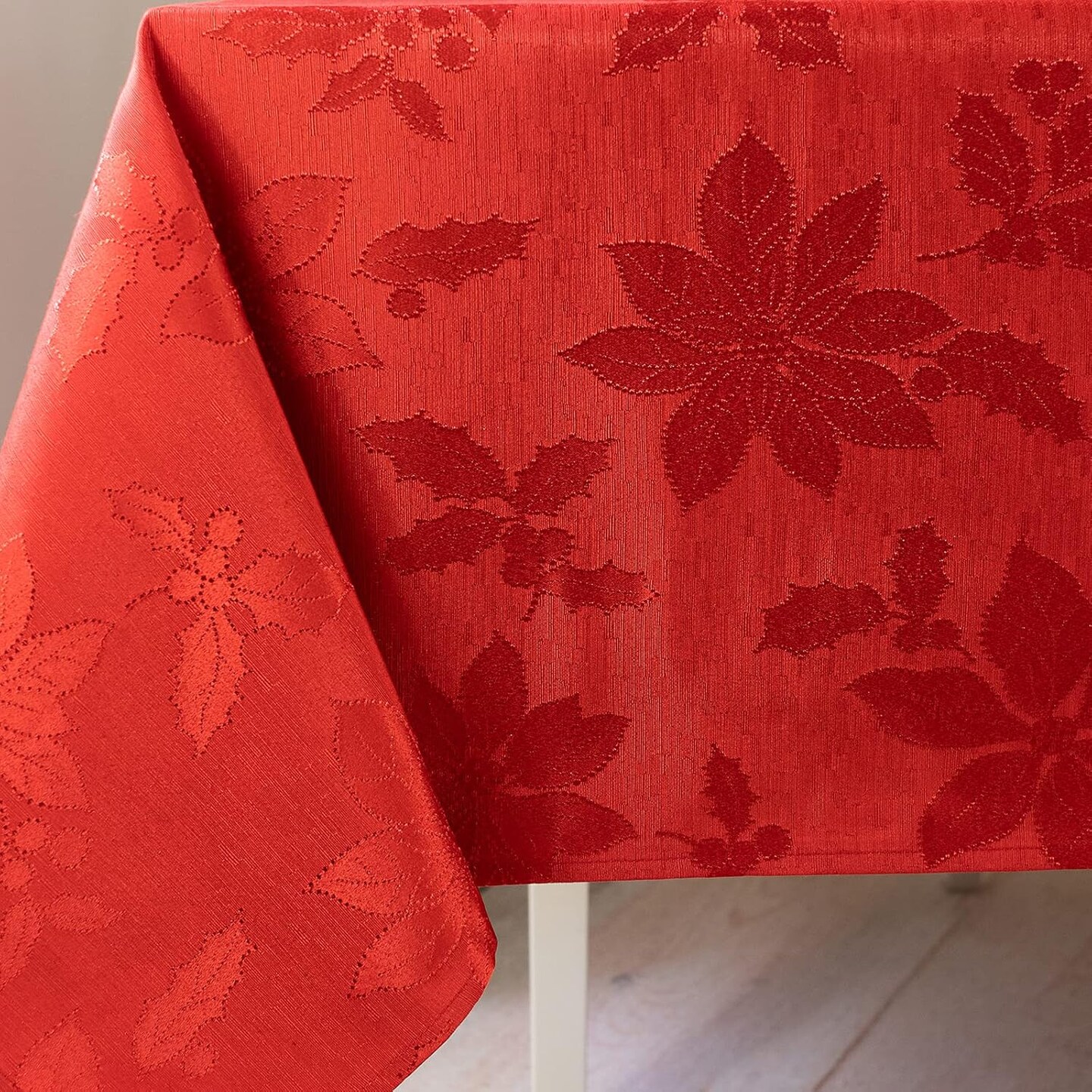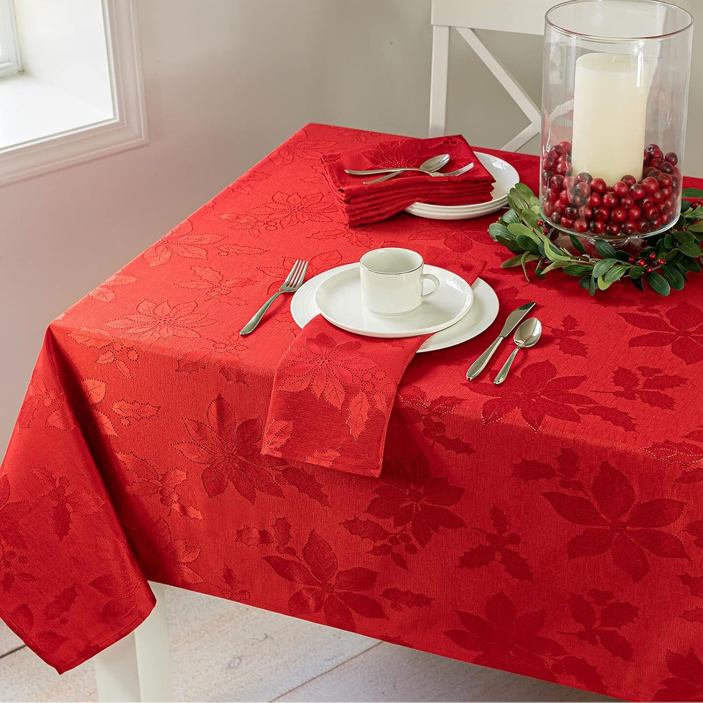 Poinsettia Legacy Damask Fabric Table Cloth, Holiday, Winter, and Christmas Tablecloth (Red, 60" X 102" Rectangular)
