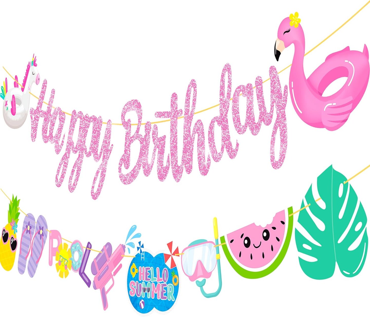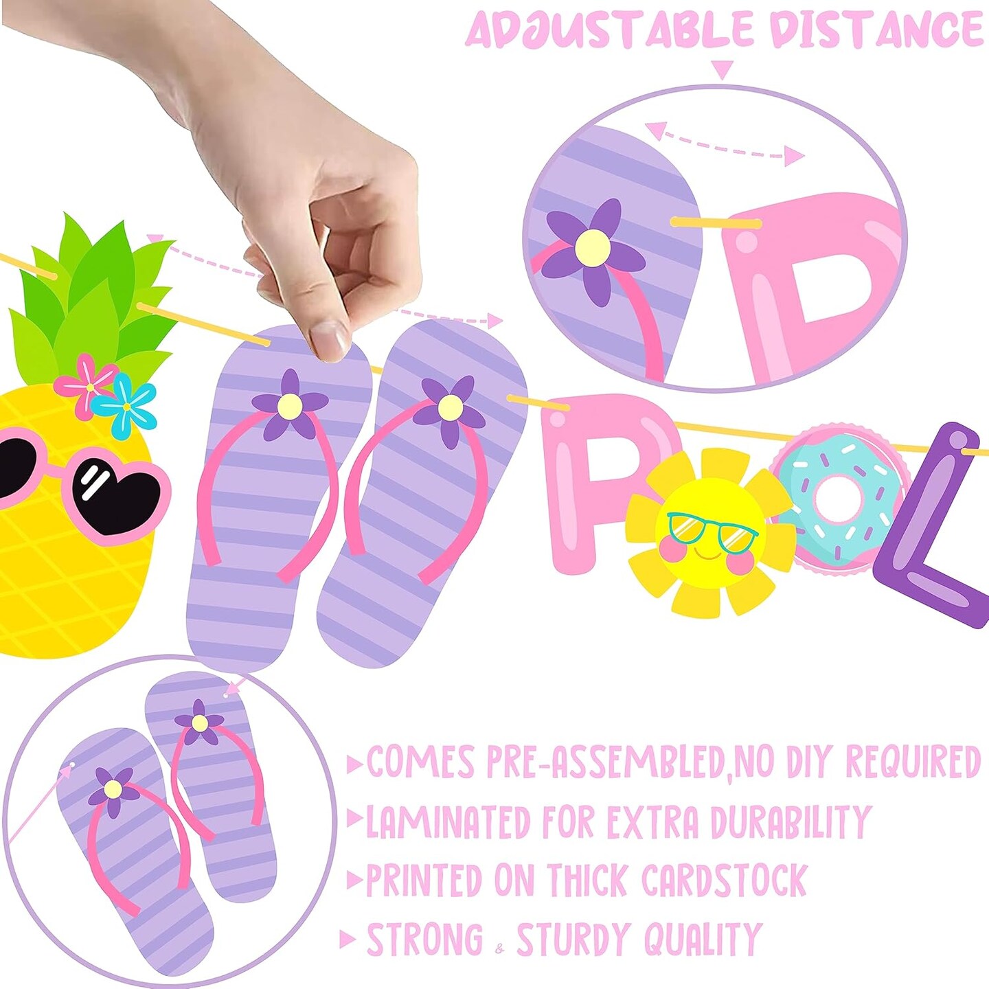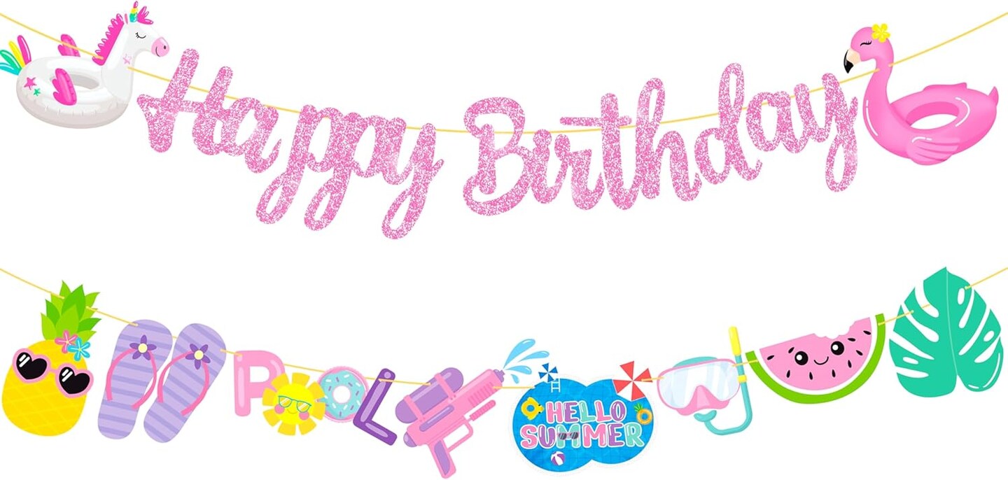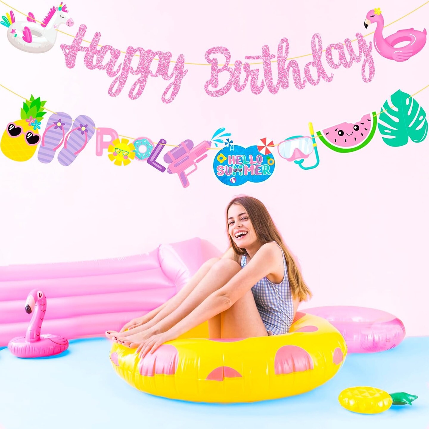 Pool Birthday Party Banners 2Pcs Swimming Pool Party Cutout Banners Glitter Pink Hawaii Pool Party Garlands Baby Shower Decorations Hello Summer Pool Supplies for Girls