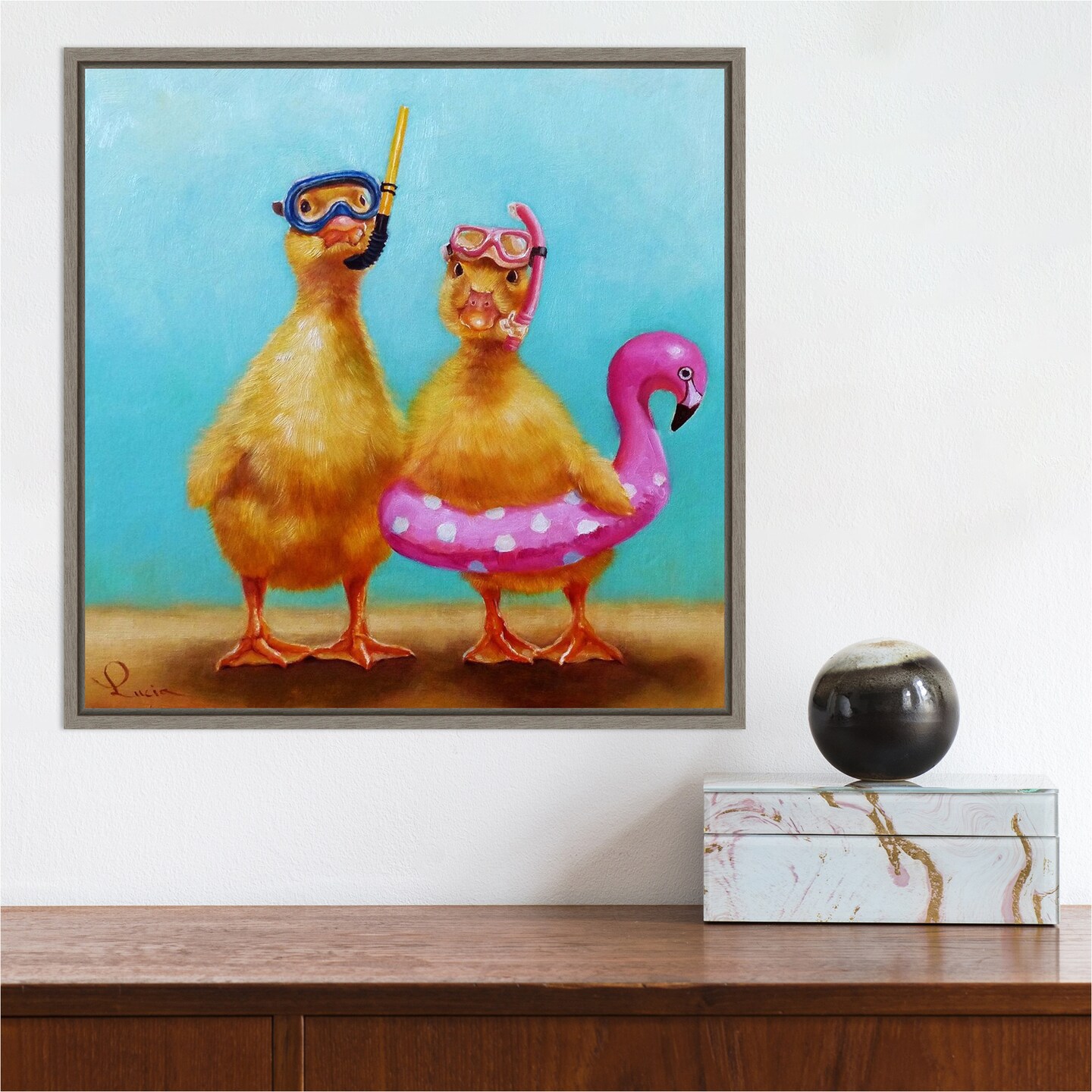 Pool Party (Ducks) by Lucia Heffernan 16-in. W x 16-in. H. Canvas Wall Art Print Framed in Grey