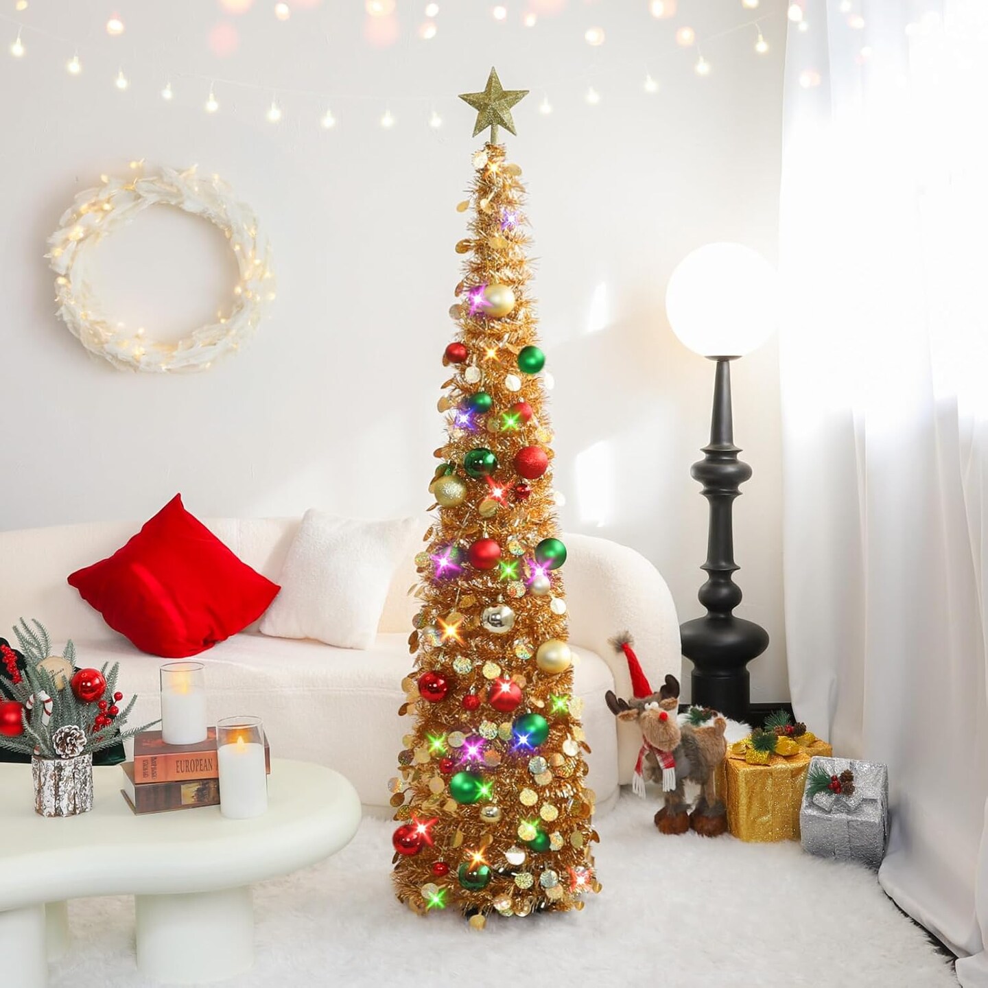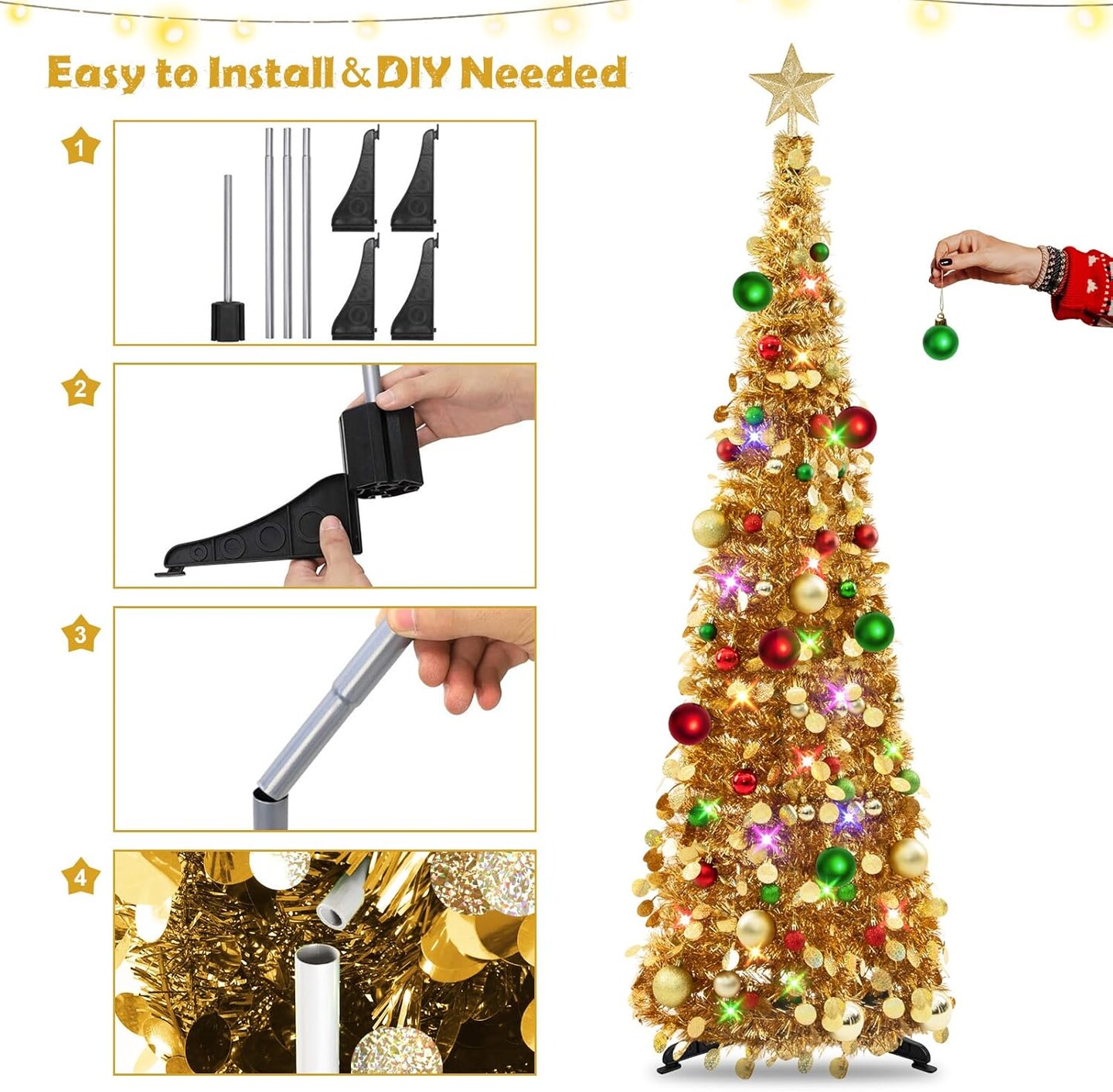 Pop Up Christmas Tree with Lights & 30 Balls(Champagne)13.38"D x 11.81"W x 2.75"H