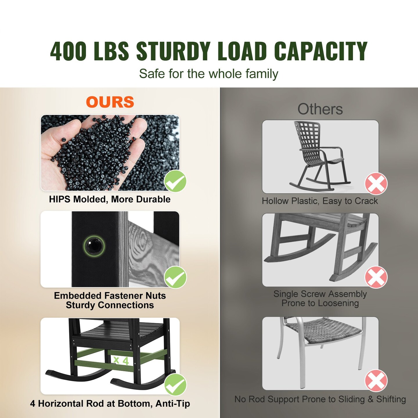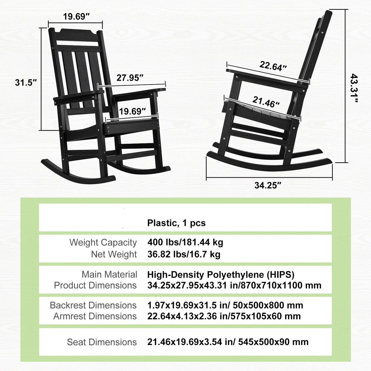 Porch Rocker HIPS Outdoor Rocking Chair High Back Patio Chair Smooth Armrests