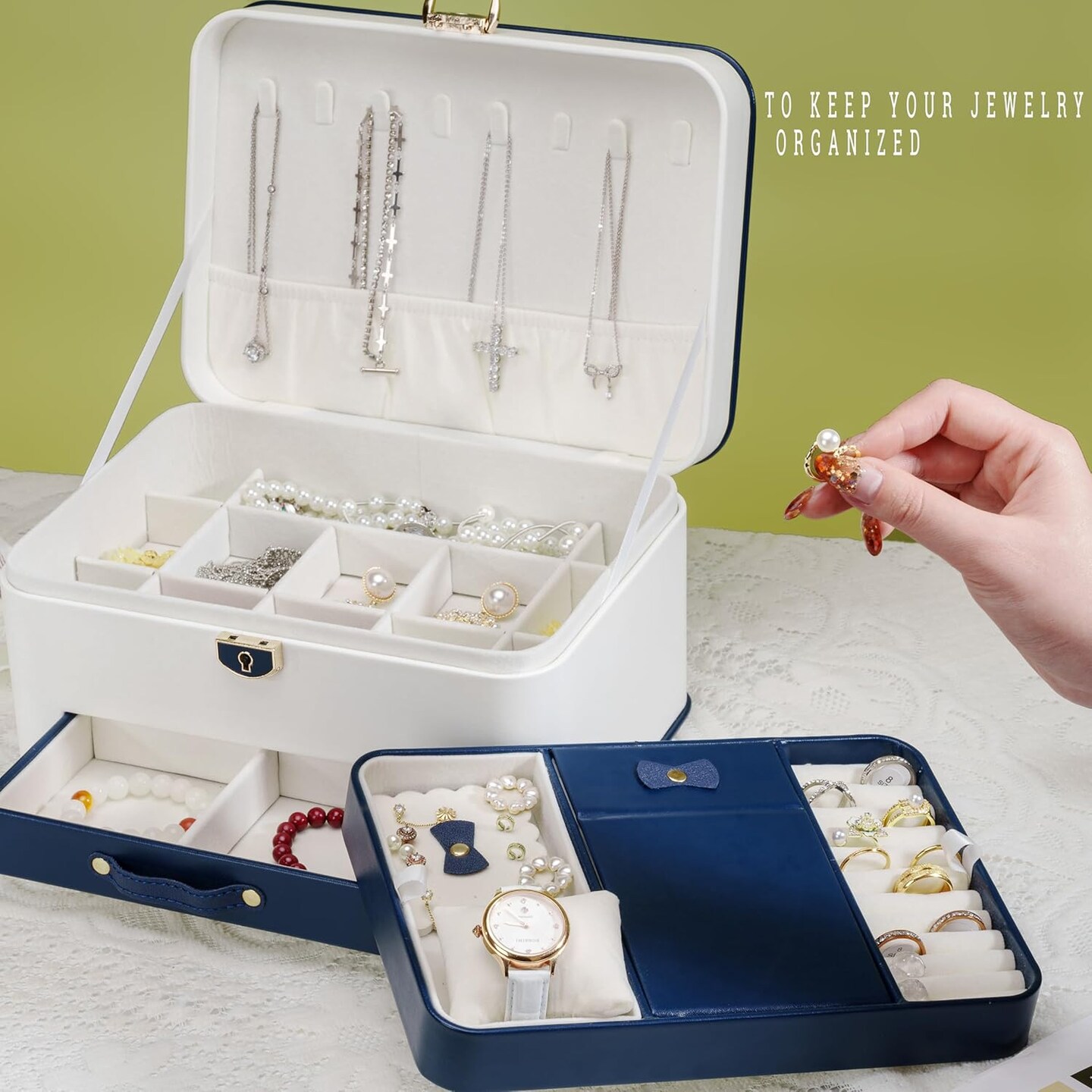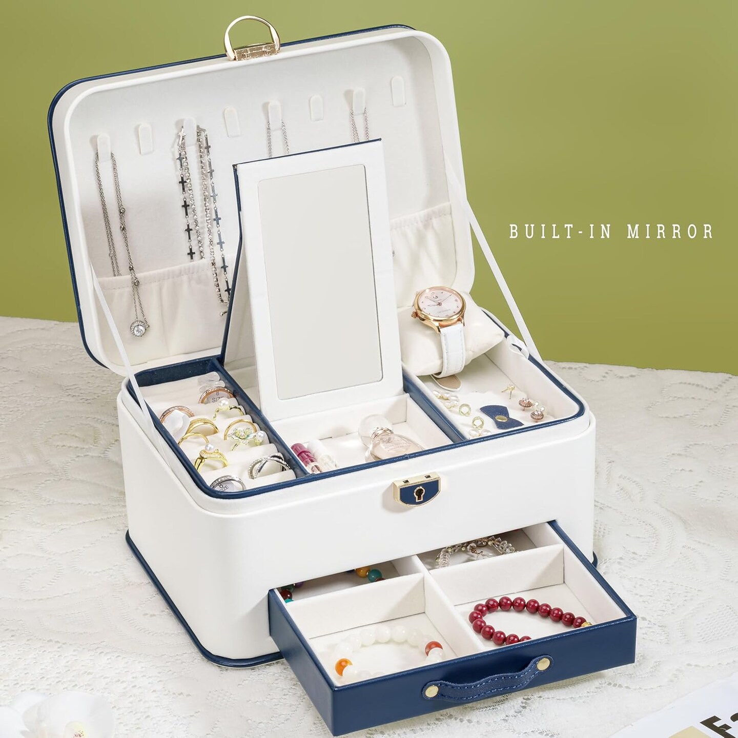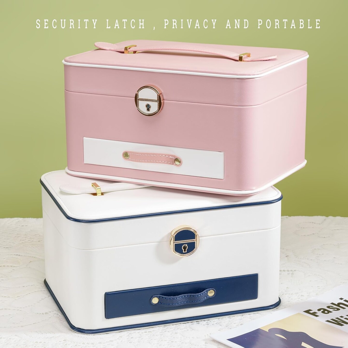 Portable Jewelry Box Mirrored Watch Organizer Necklace Ring Earring Storage Lockable Gift Case Travel Jewelry Storage (White + Pink) (white)