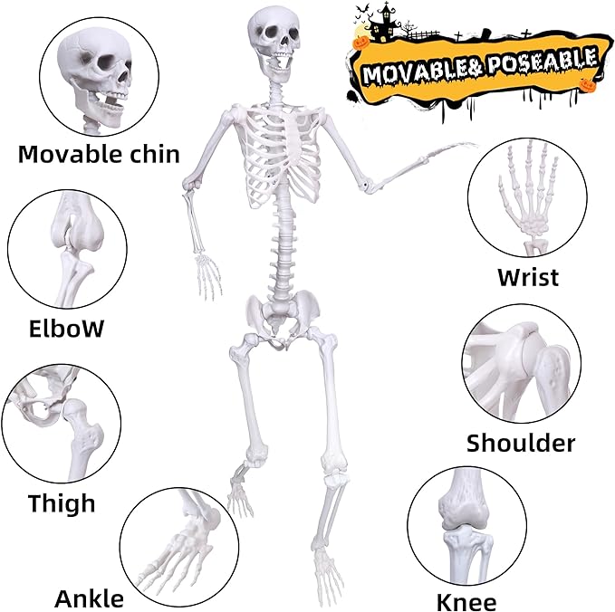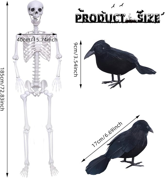 Posable Skeleton with Movable Joints Halloween Full Body Plastic Human Skeletons with 2PCS Black Crows for Halloween Indoor Outdoor Decor