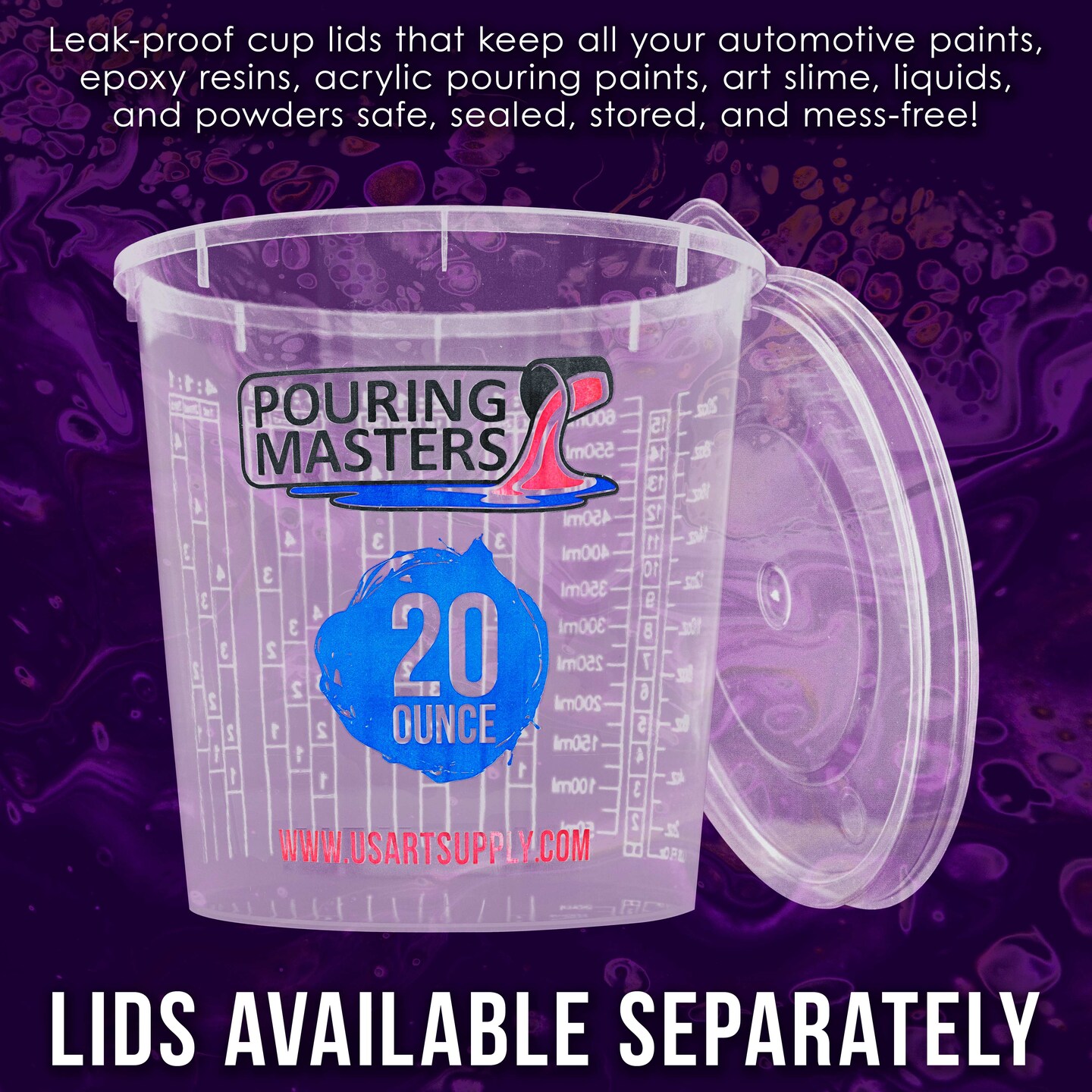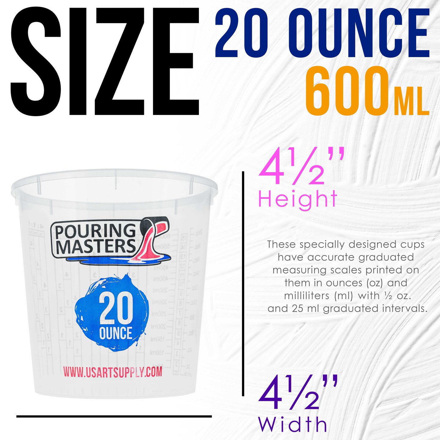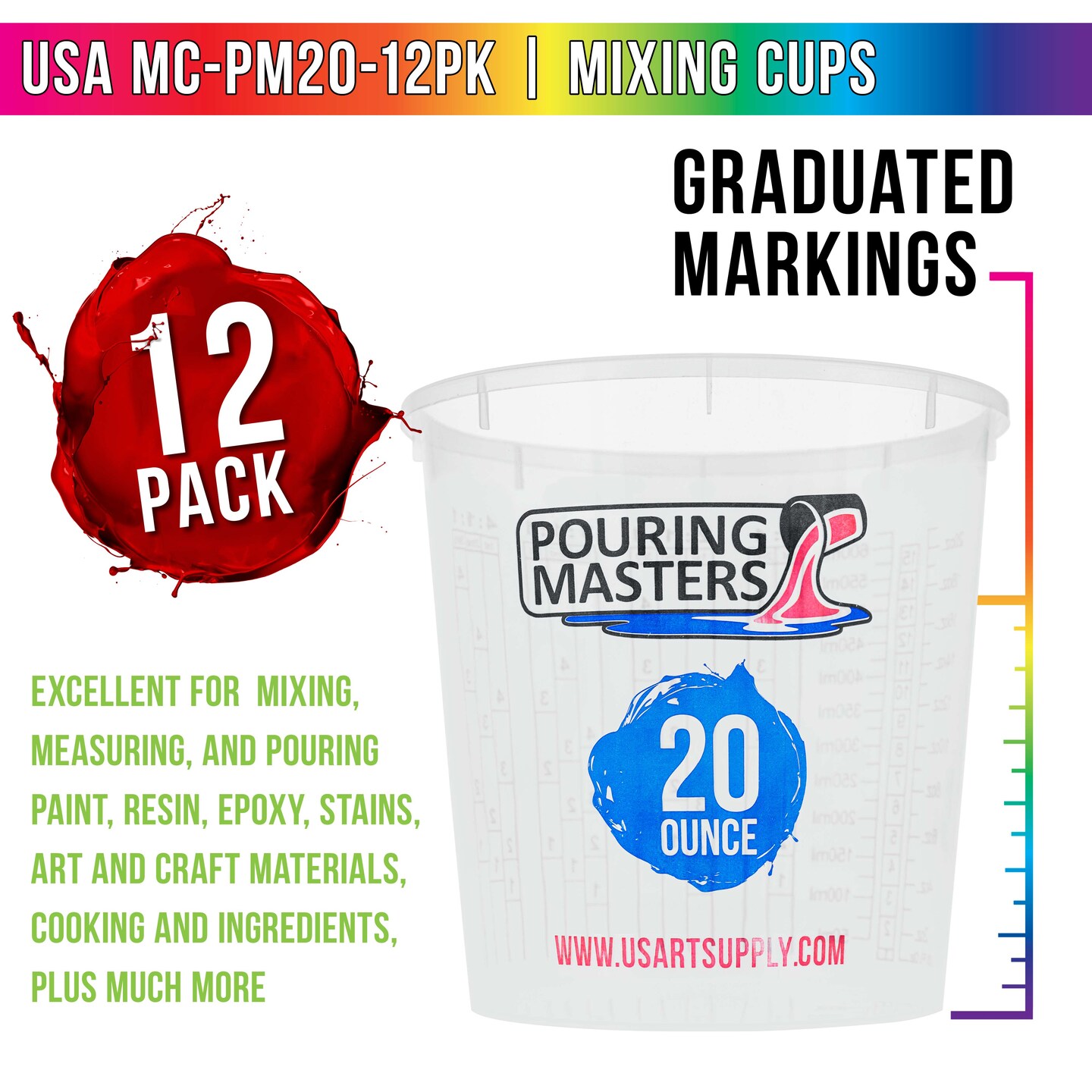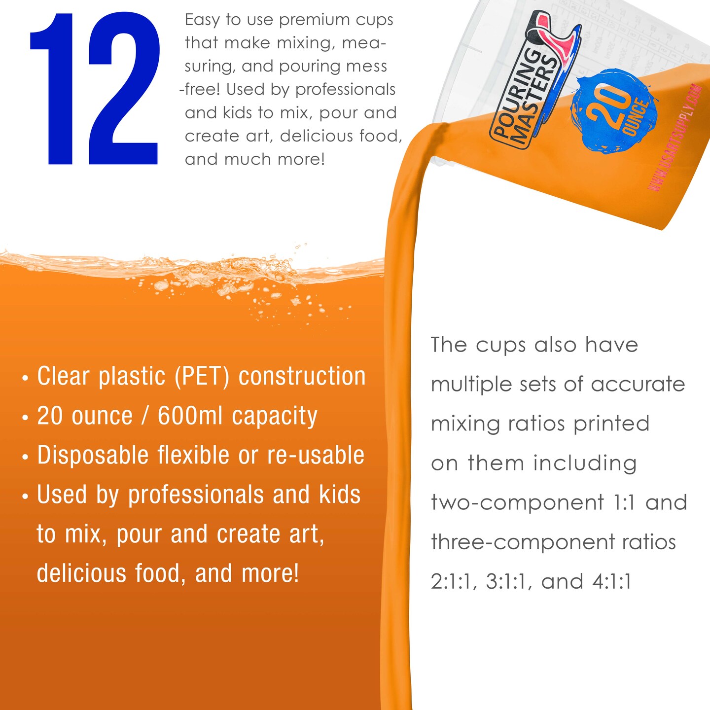 Pouring Masters 20 Ounce (600ml) Graduated Plastic Mixing Cups (Box of 12) - Paint Mixing Cups for Epoxy Resin, Art, Kitchen, Baking - Measurements in OZ and ML, 4 Different Measuring Ratios 1:1