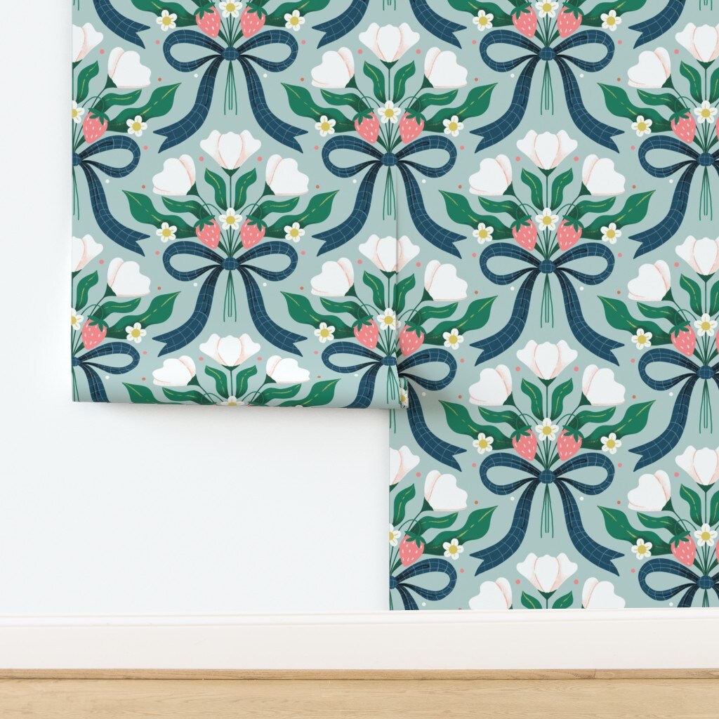 Preppy Floral Light Blue Dark White Green Pink Damask Custom Removable Wallpaper by Spoonflower Peel & Stick Wallpaper 2FT Wide