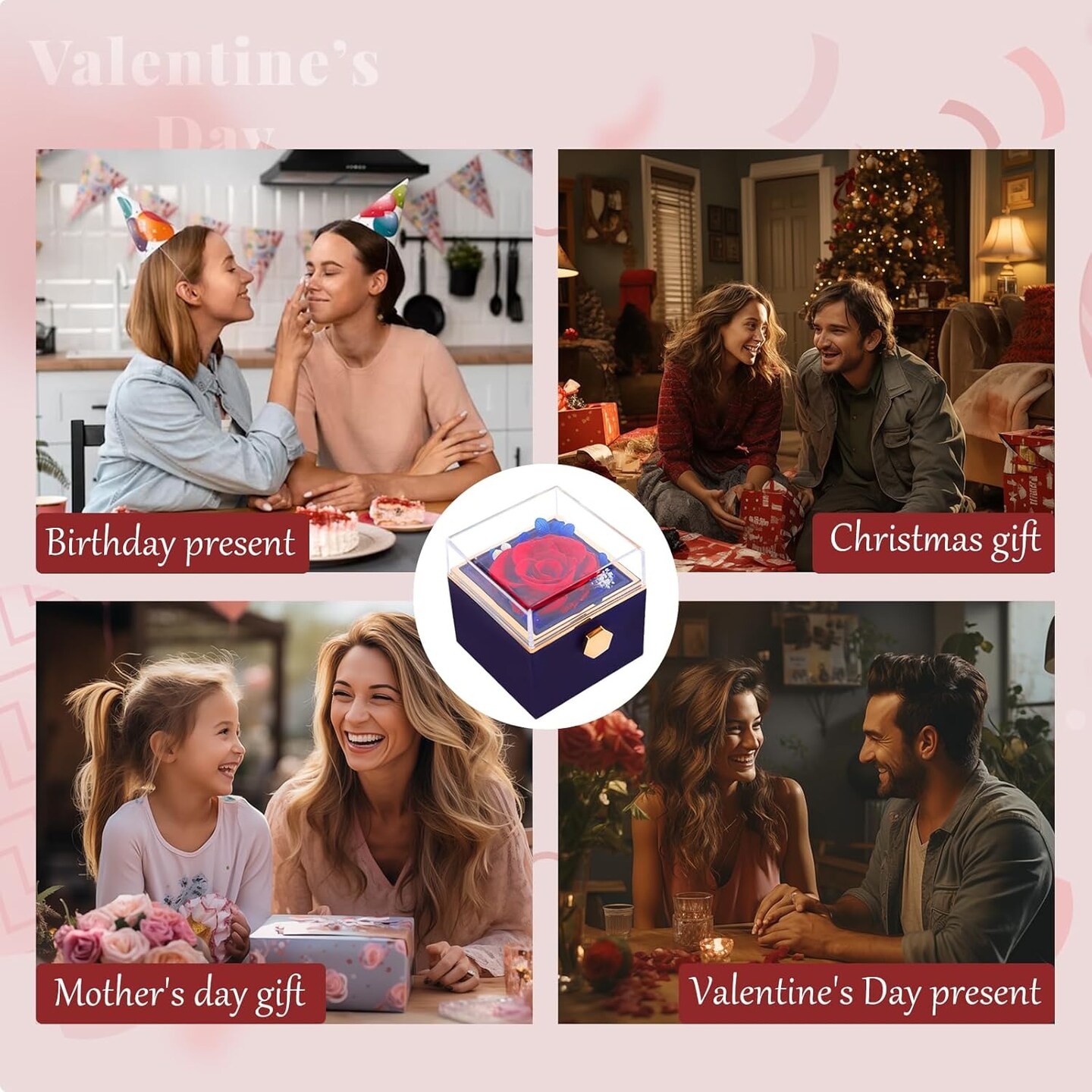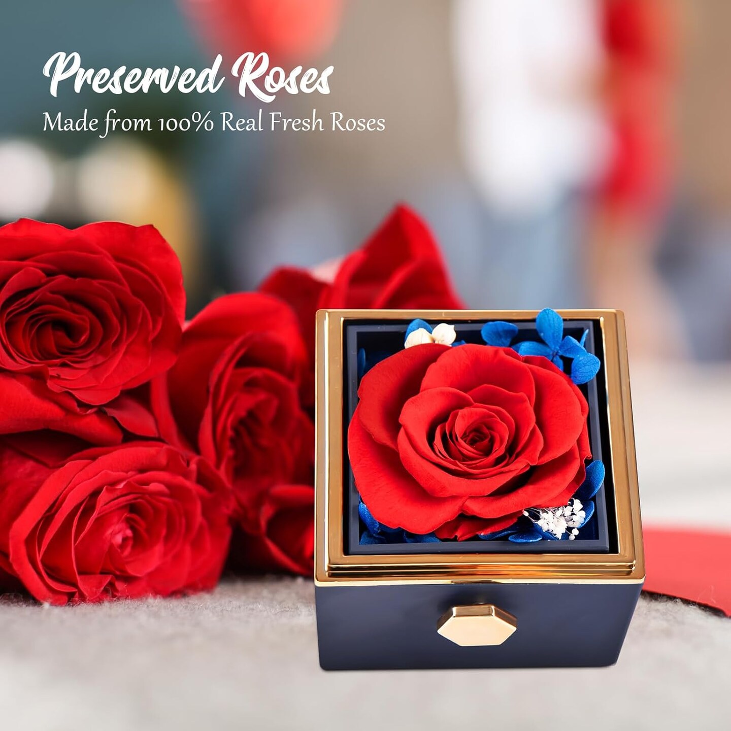 Preserved Real Red Flowers Rotating Box