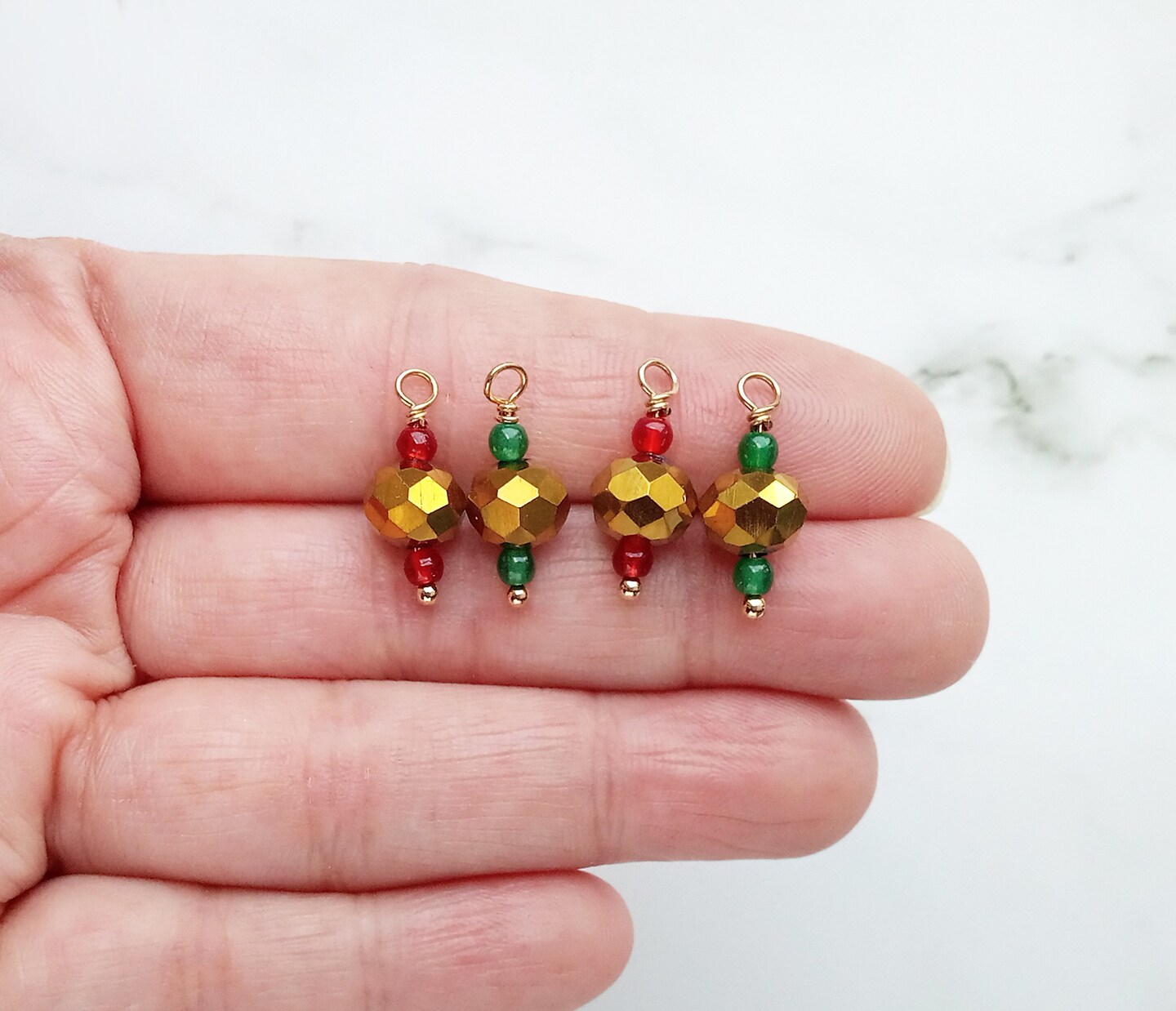 Pretty Christmas Beaded Charms, 8 pieces, Gold Red & Green Glass Bead Dangles, Adorabilities.