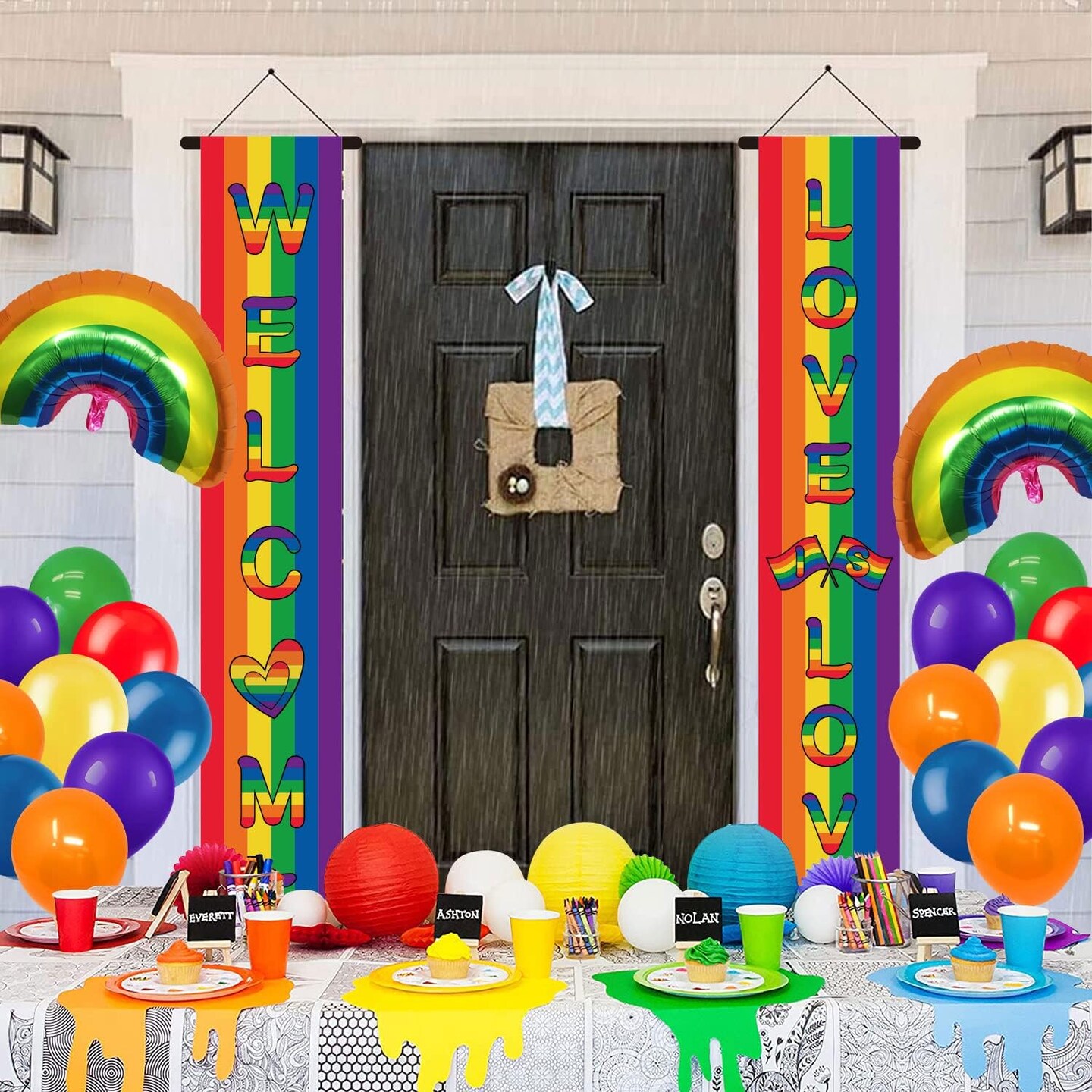 Pride Decorations Set - Gay Pride Party Decorations Include Porch Sign, Banner, Balloon, Tattoos, Cake Topper, Curtain, Paper Poms, LGBT Pride Month Rainbow Theme Party Decorations Supplies