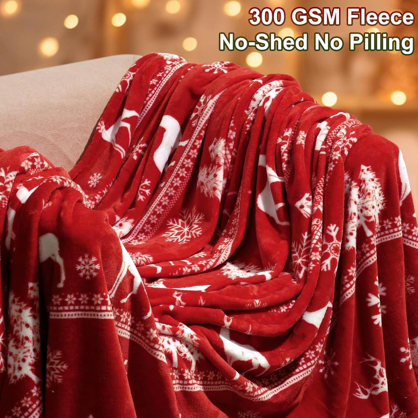 Printed Fleece Throw Blanket, No Shed No Pilling Ultra Soft Plush Cozy Xmas Prints Theme Home Décor Flannel Blanket for Bed, Sofa, Couch and Gift, 50" x 60", Reindeer and Trees, Red
