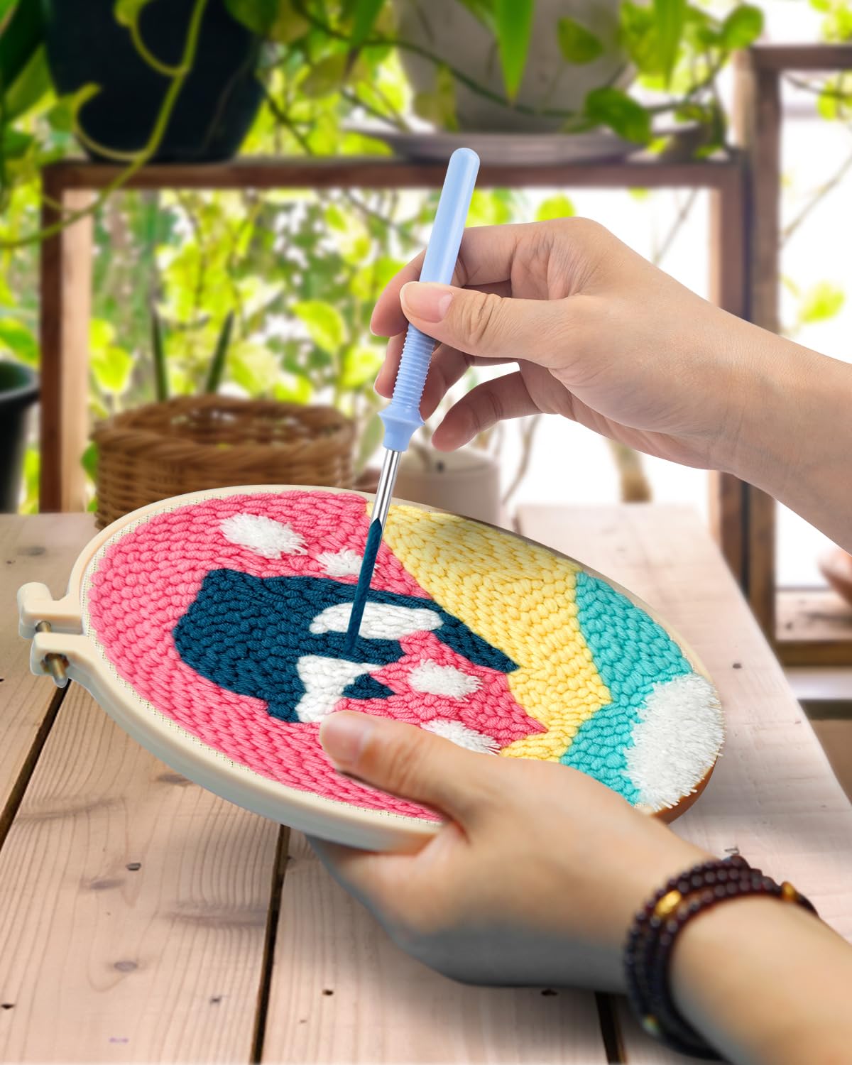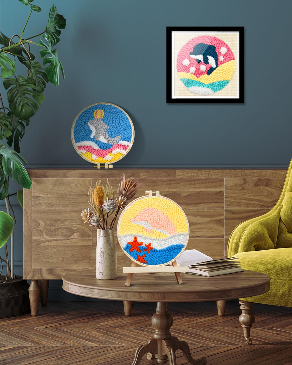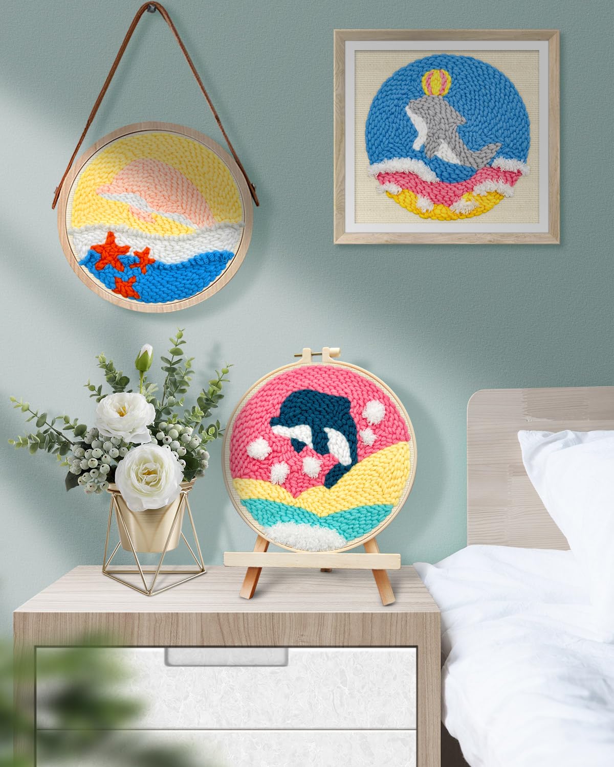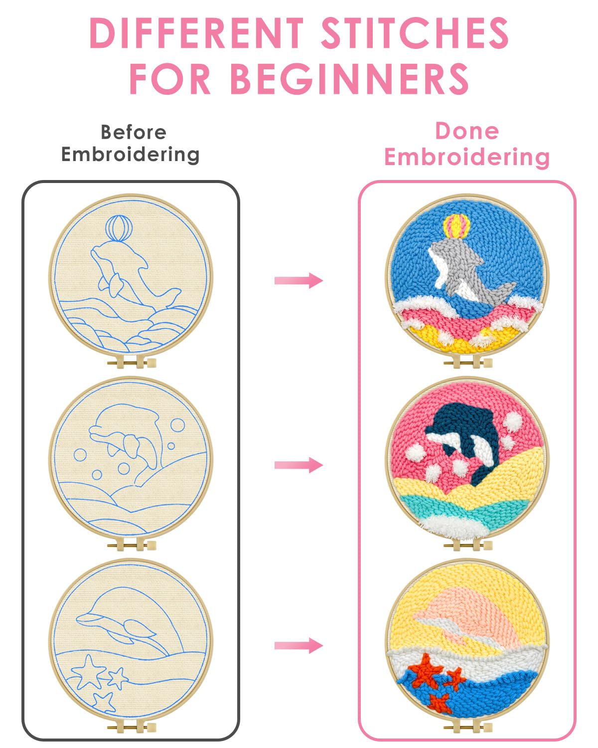 Punch Needle Kits, 3 Pack Punch Needle Embroidery Kits for Adults Beginner, Tool with Punch Needle Fabric, Hoops, Yarns and Sewing Needles (Dolphin)