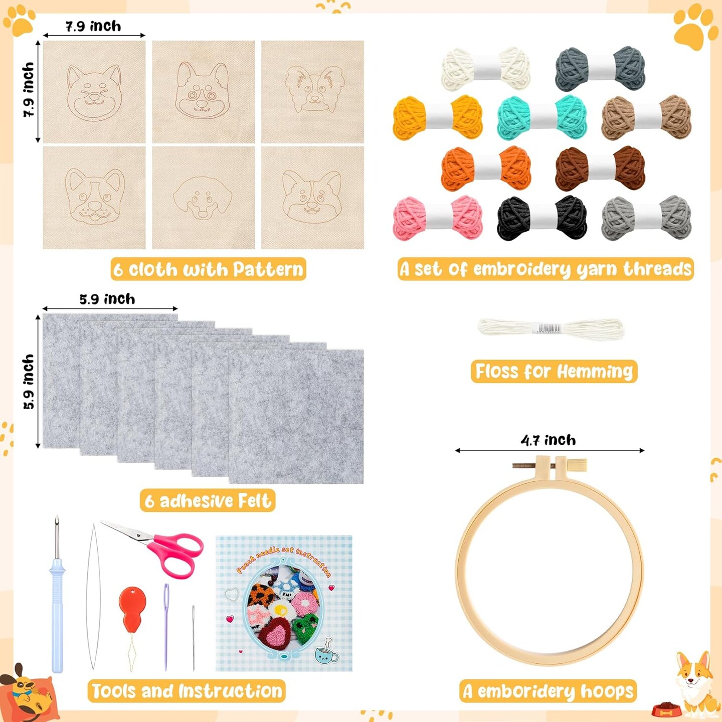 Puppy Punch Needle Coaster Kit - 6 Patterns Dog Punch Needle Embroidery Craft Kit, DIY Felting Coaster for Adults Beginners with Adhesive Yarns Fabric Felt Hoop Tools Instruction