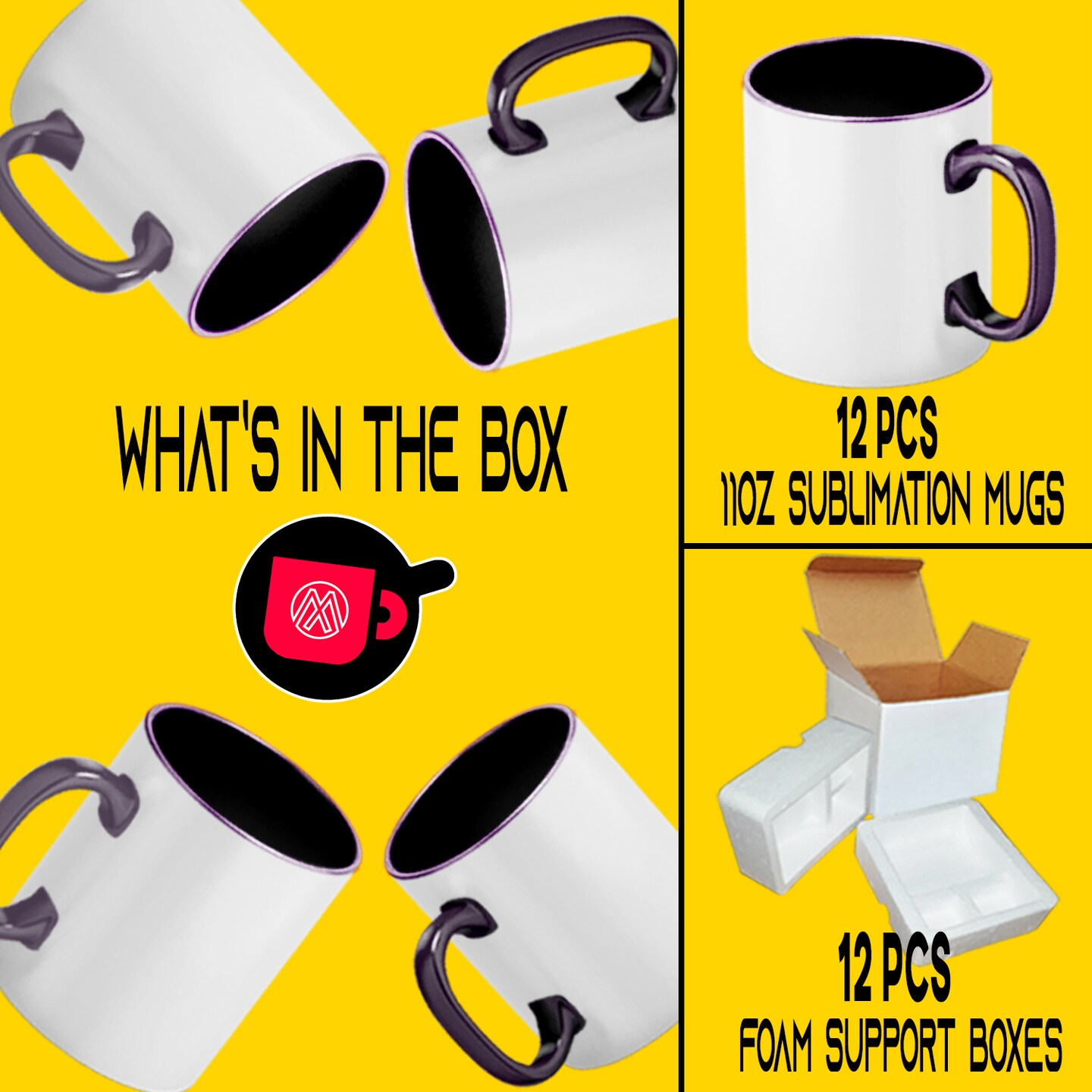 Purple Sublimation Mugs - 12 Pack (11oz) | Purple Interior And Handle | Individually Packaged | Foam Support Boxes