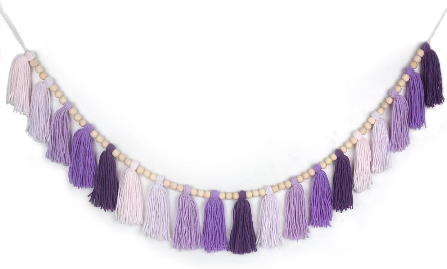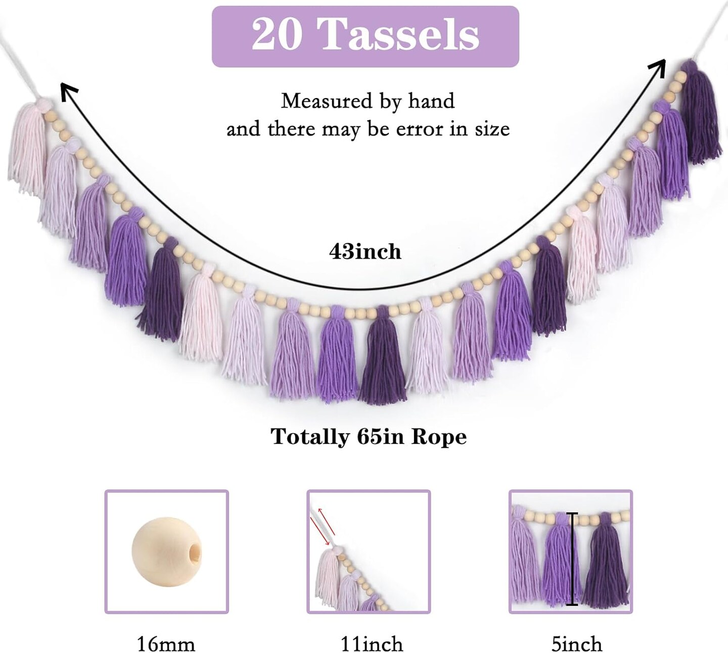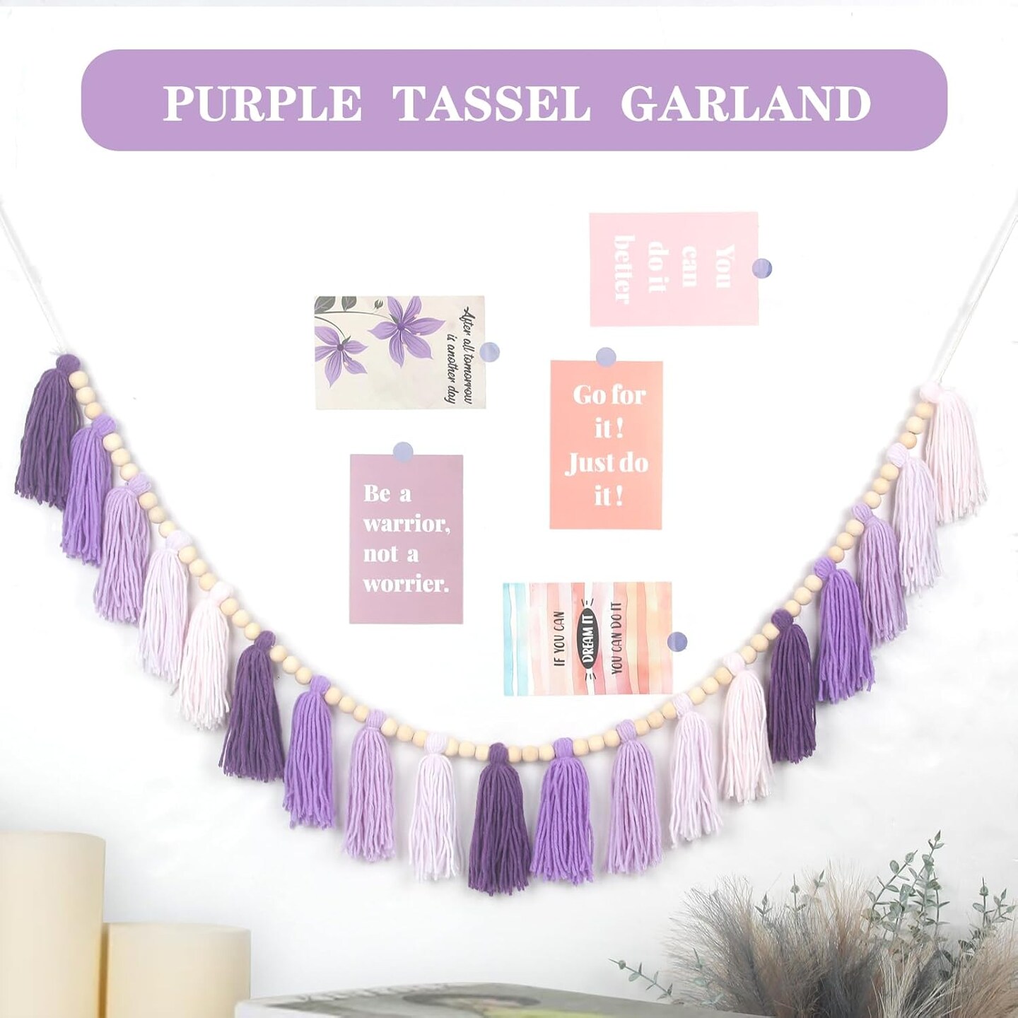 Purple Yarn Wood Bead Tassel Garland Wall Hanging Decor Boho Lavender Banner Tassels for Classroom Baby Shower Birthday Party Nursery Girls Dorm Room Bedroom Wedding Decorations
