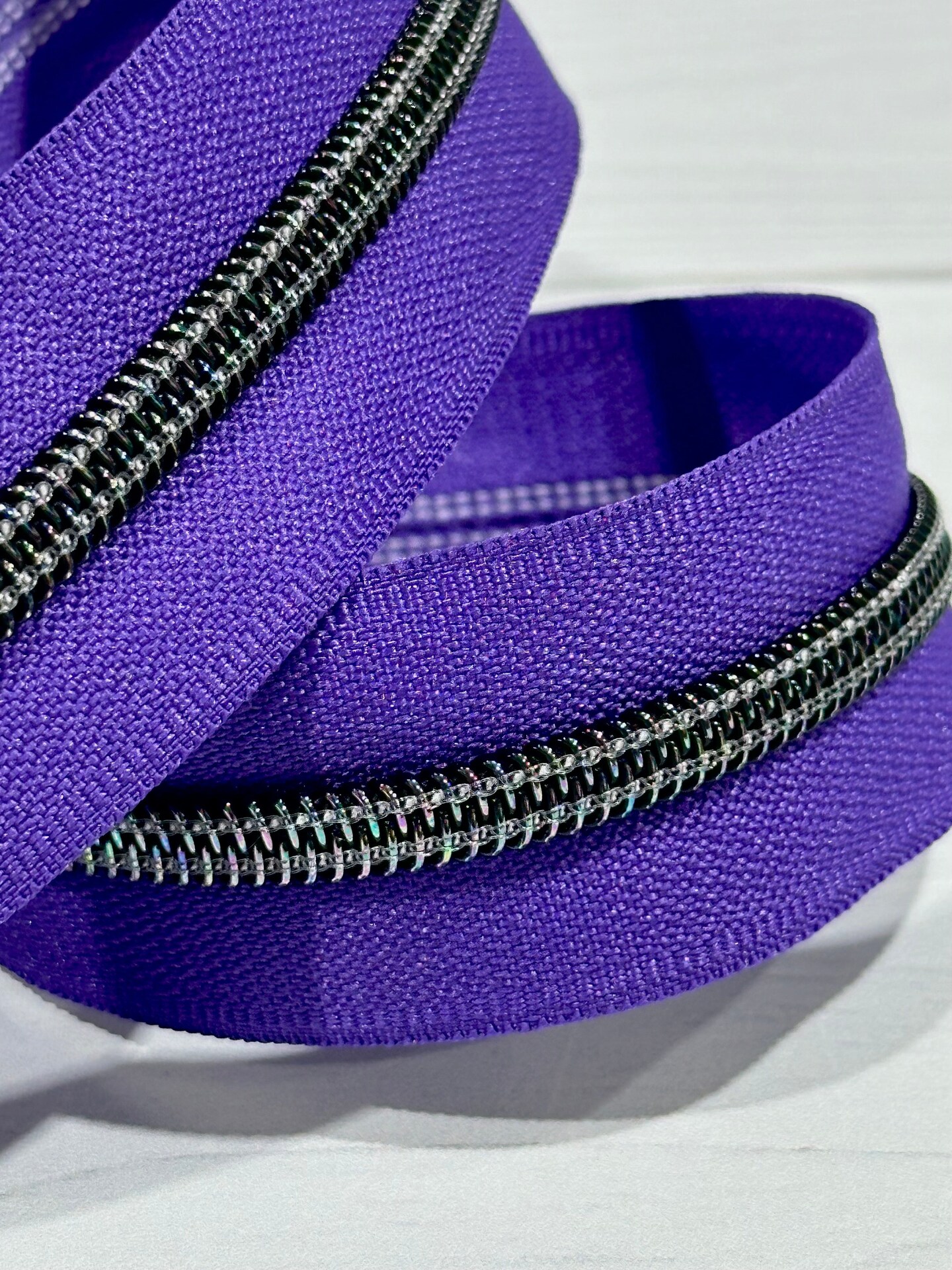 Purple zipper tape with iridescent teeth