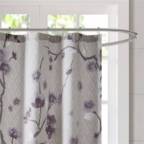 Purple-Grey Beige Cotton Floral Shower Curtain Machine Washable