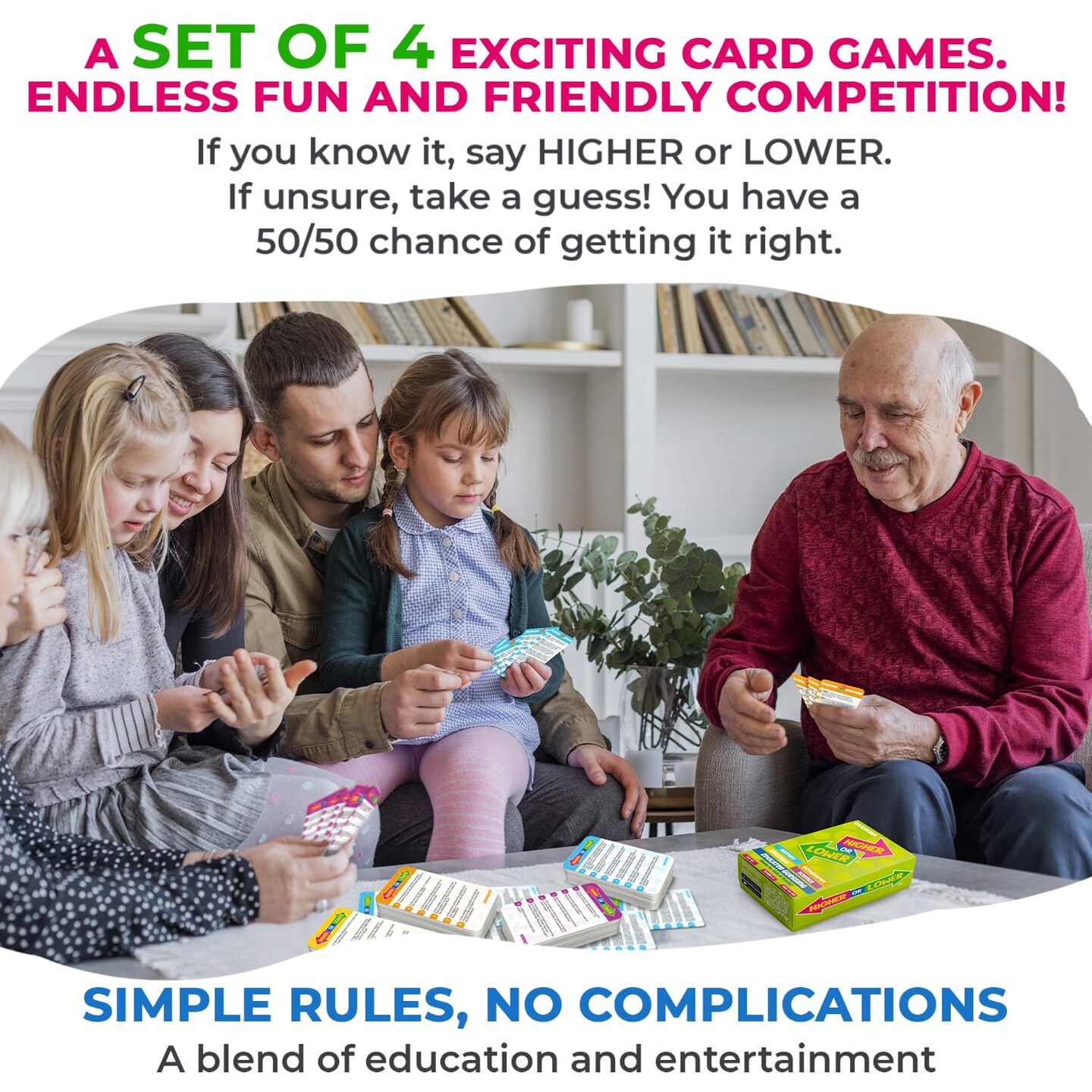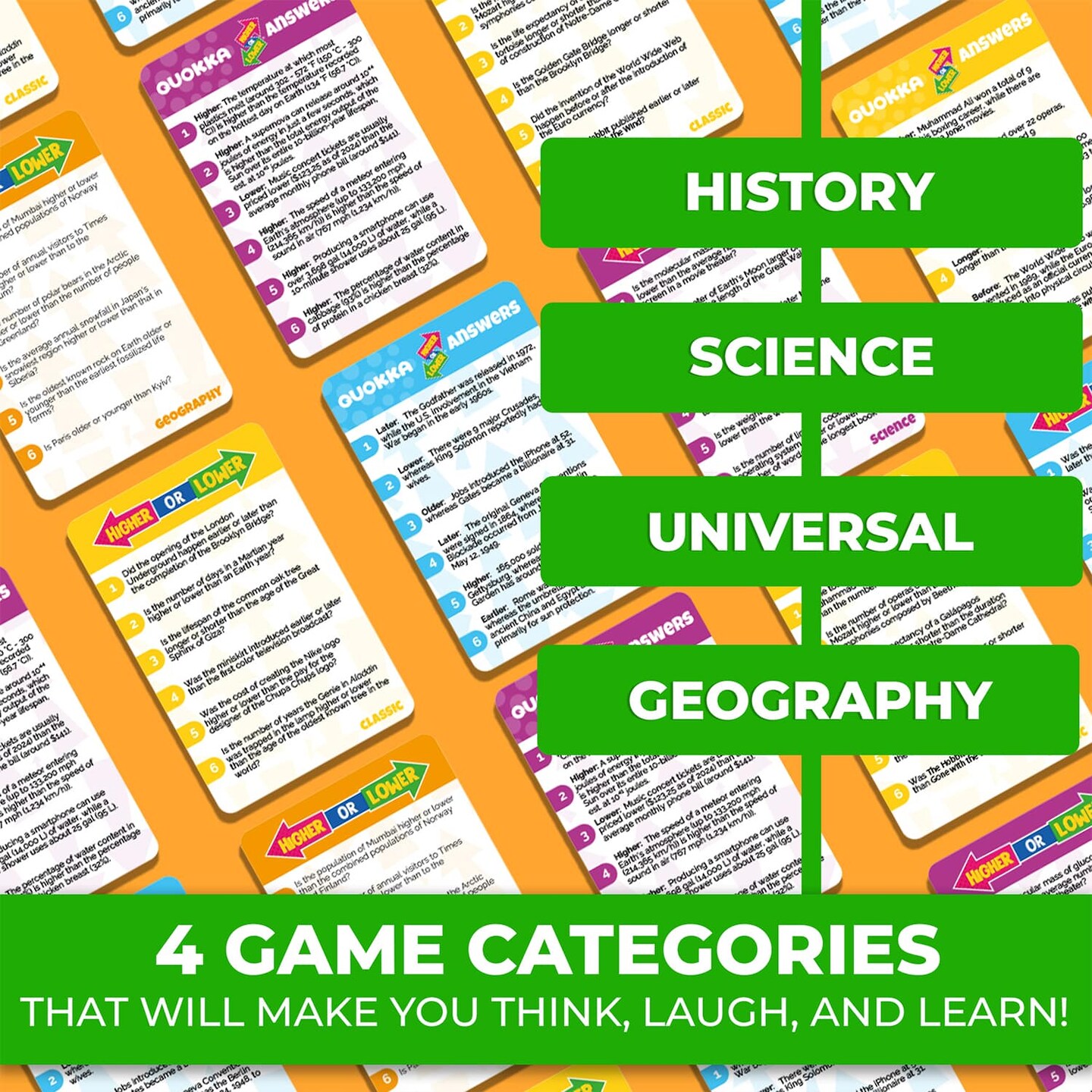 QUOKKA Trivia Board Games for Kids and Adults - Family Night Board Game Cards 4xSet Higher or Lower | Guess Fun Questions | Easy to Learn | 2 + Players - Challenge History, Science, Geography & More