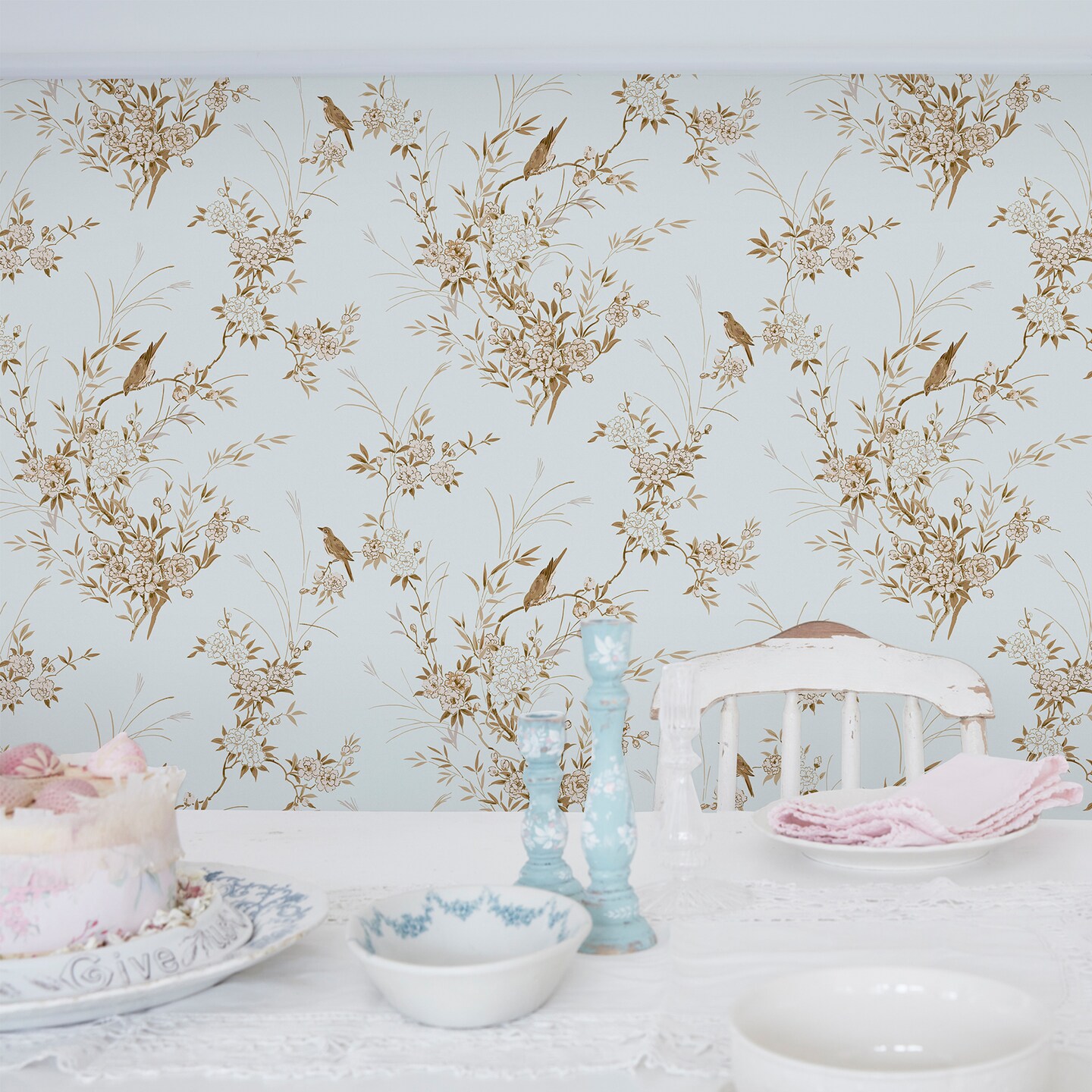 Rachel Ashwell Bird Chinoiserie Blue Gold Wallpaper