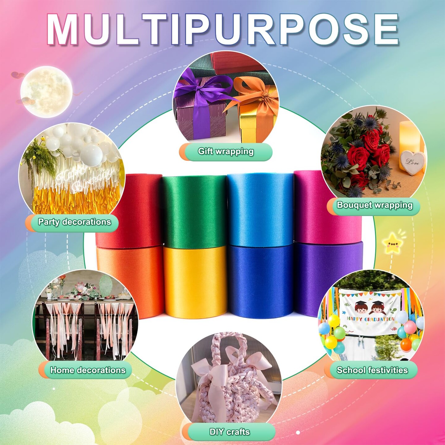 Rainbow Satin Ribbon 87.5 Yds × 2 Inch Wide Colorful Ribbon 8 Rolls Assorted Bulk Ribbons Set for Gift Wrapping DIY Crafts Tassel Garland Fiesta Party Classroom Outdoor Ribbon Decorations