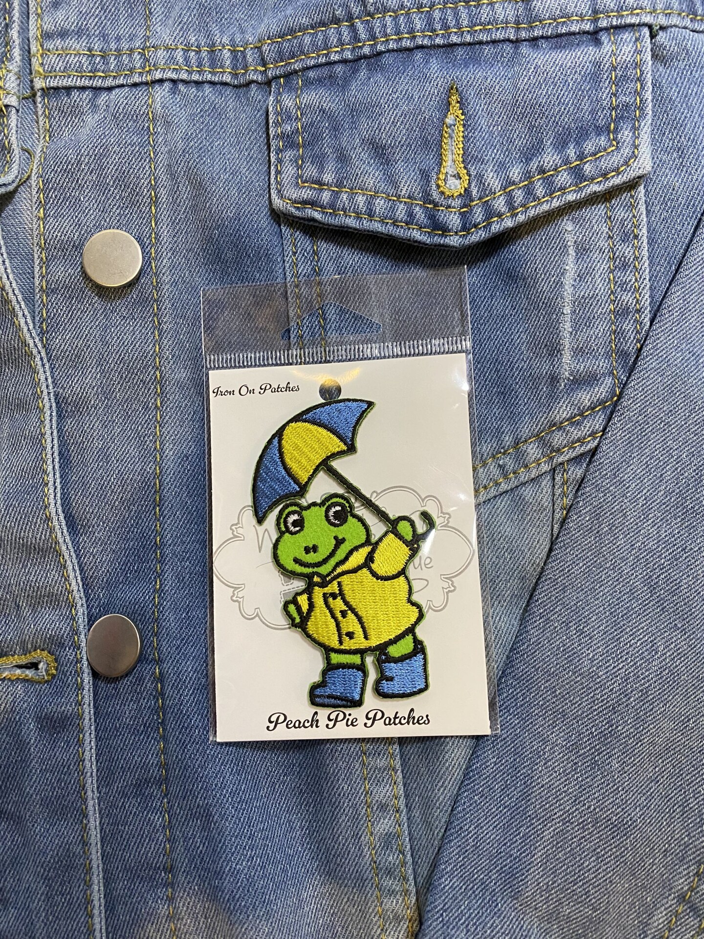 Rainy Day Frog Holding an Umbrella, Embroidered, Iron on Patch