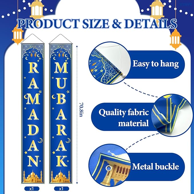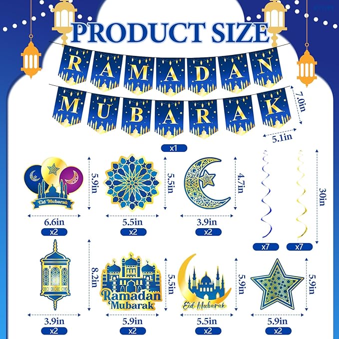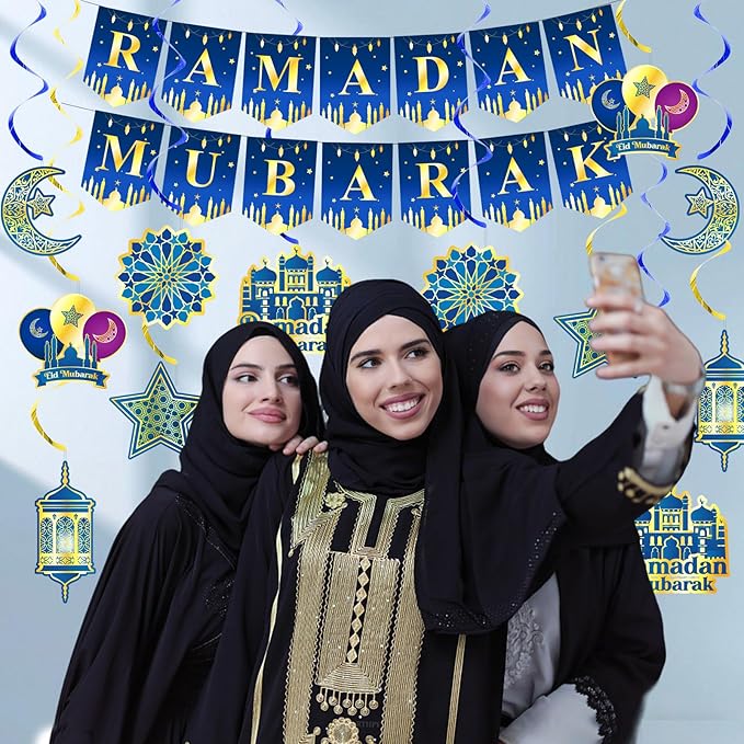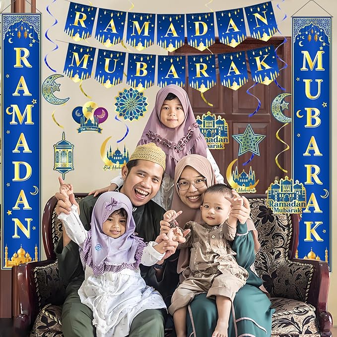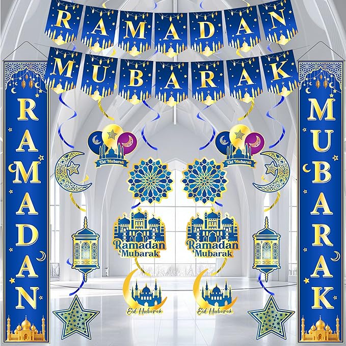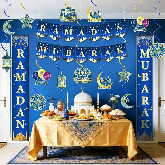 Ramadan Mubarak Decorations Set, Eid Mubarak Banner with Hanging Swirls, Muslim Islamic Porch Door Sign for Ramadan & Eid al-Fitr Home Party Decor