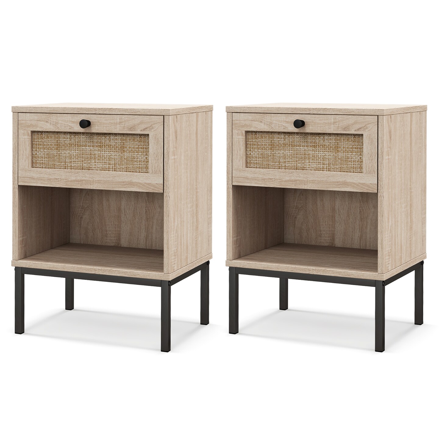 Rattan Nightstand Boho End Table with Rattan Drawer and Open Shelf Set of 2-Oak