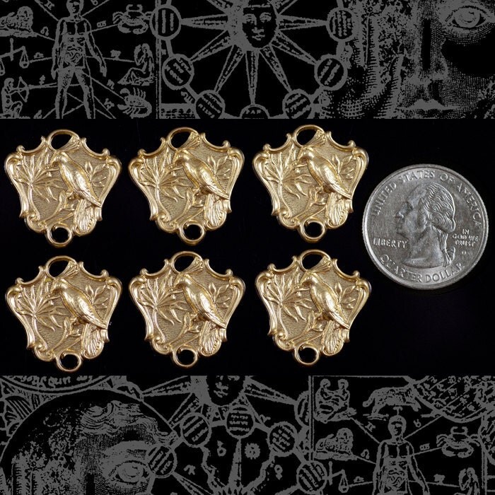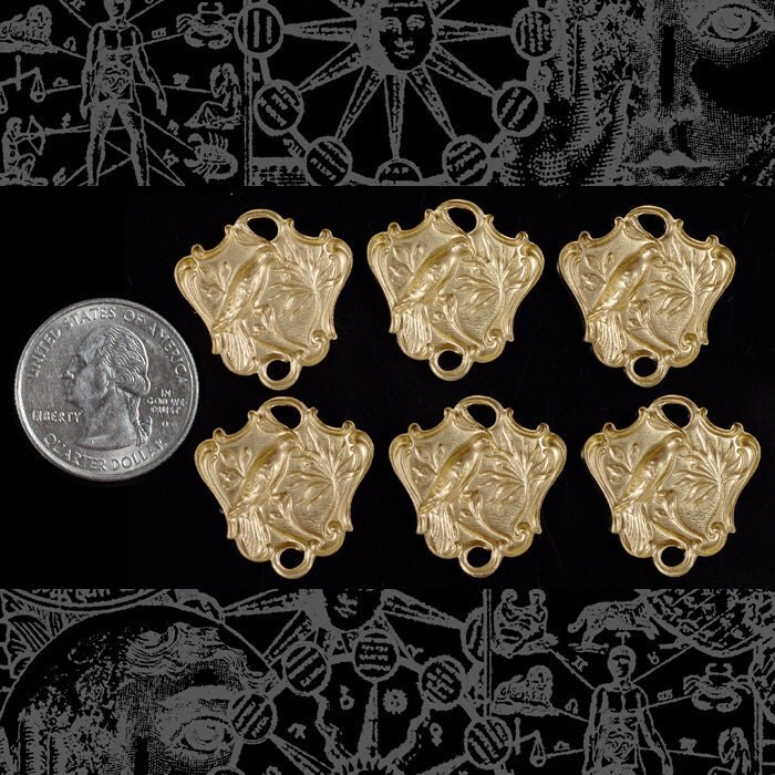 Raw Brass Embossed Bird Shield Connectors - Set of Six - B-2C33