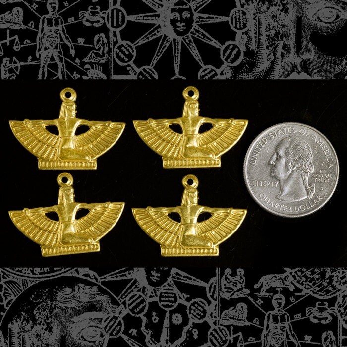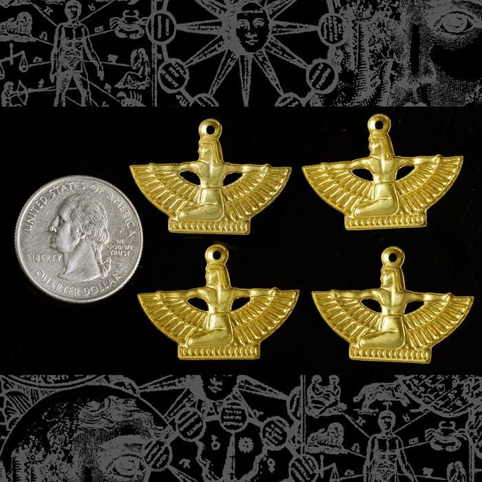 Raw Brass Mini Winged Egyptian Goddess Pendants or Charms - Set of Four - B-P57