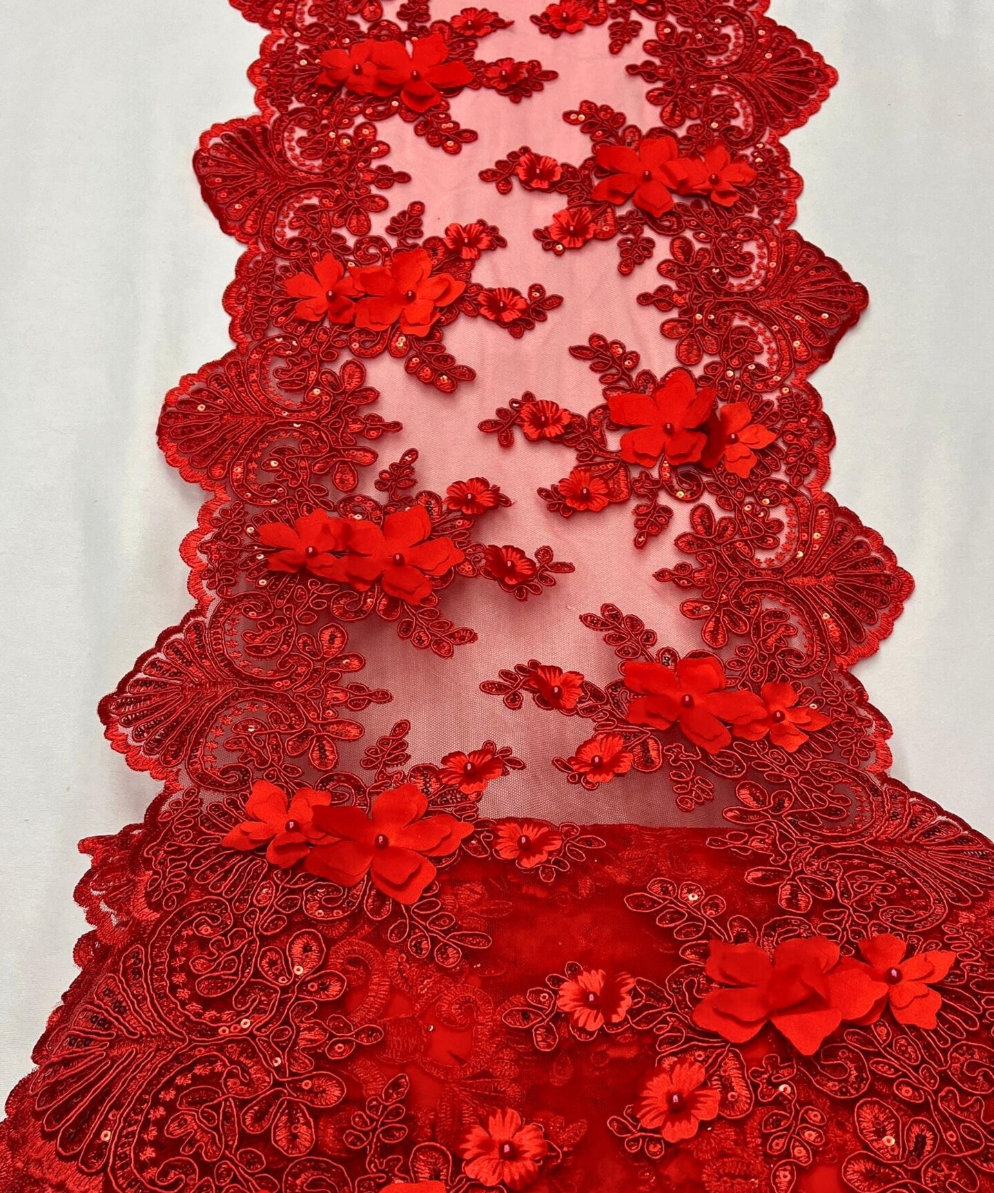 Red 3D Wide Floral Sequin & Mesh with Pearls Lace Trim for Table Runner 13"