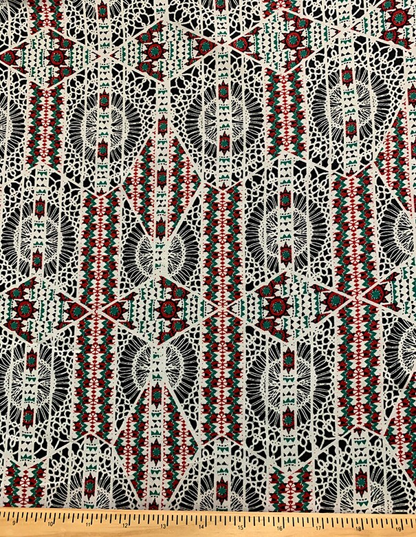 Red and Green Lace Look Print Rayon Challis Fabric By the Yard