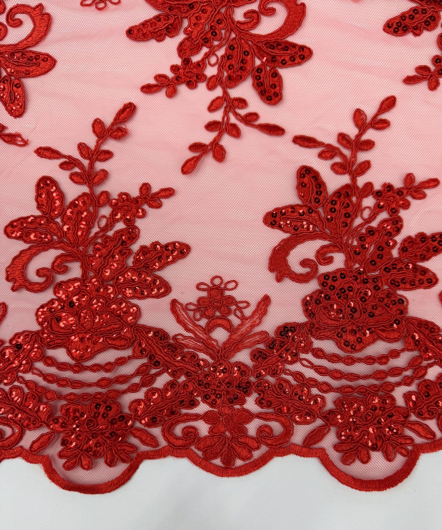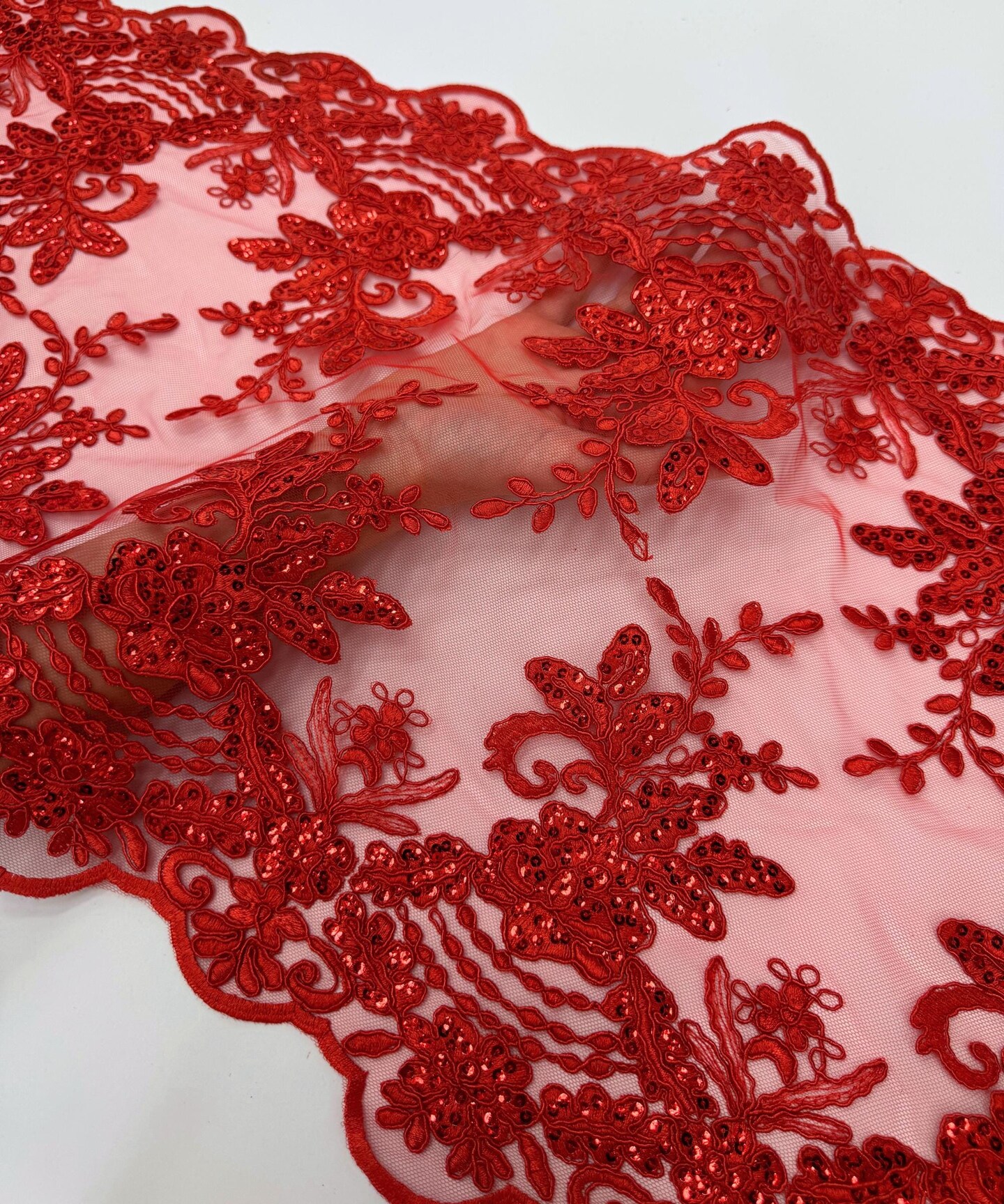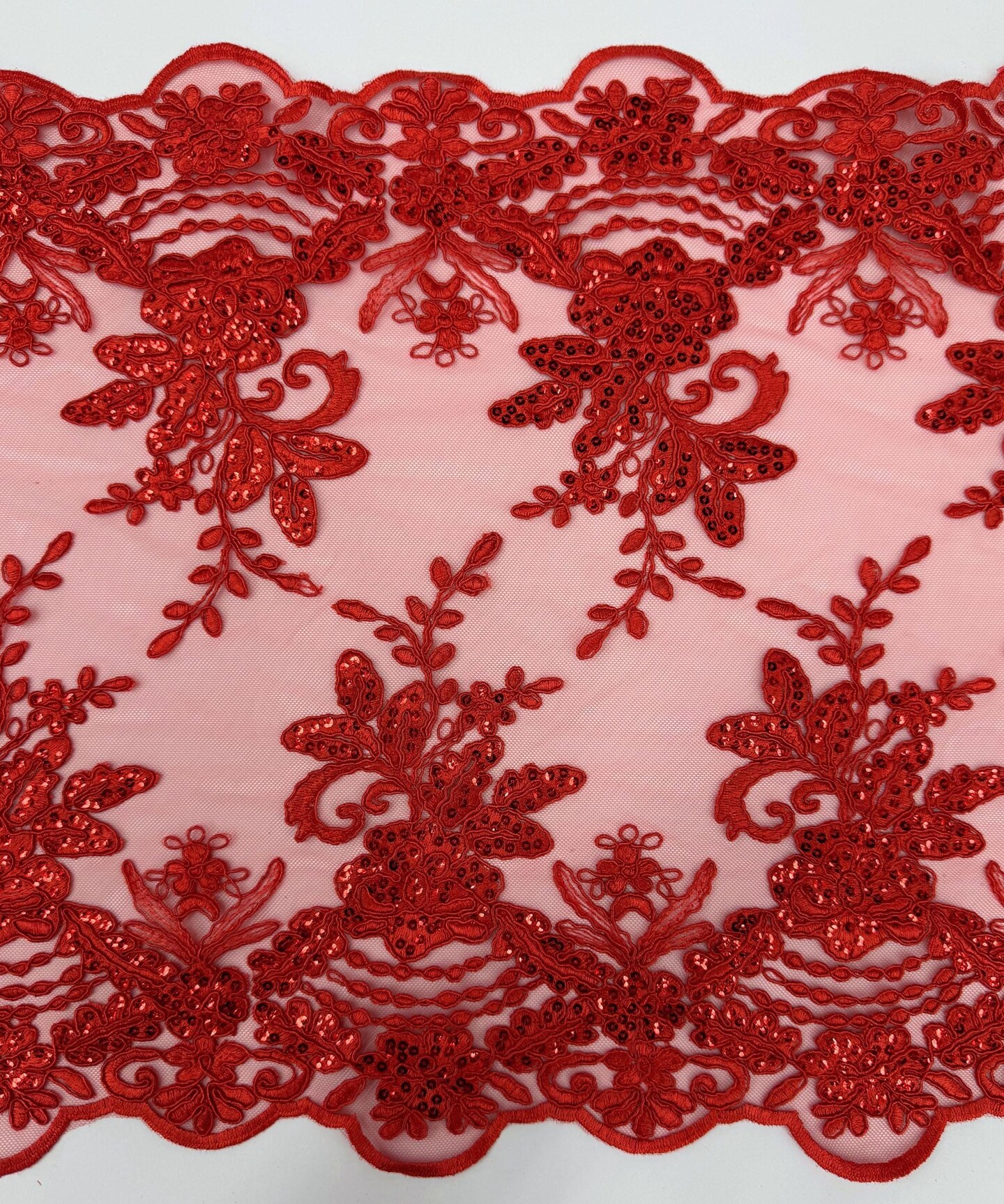 Red Floral Embroidered Lace Table Runner by the Yard, 14" Wide Sequin Mesh Lace Trim with Scalloped Edges