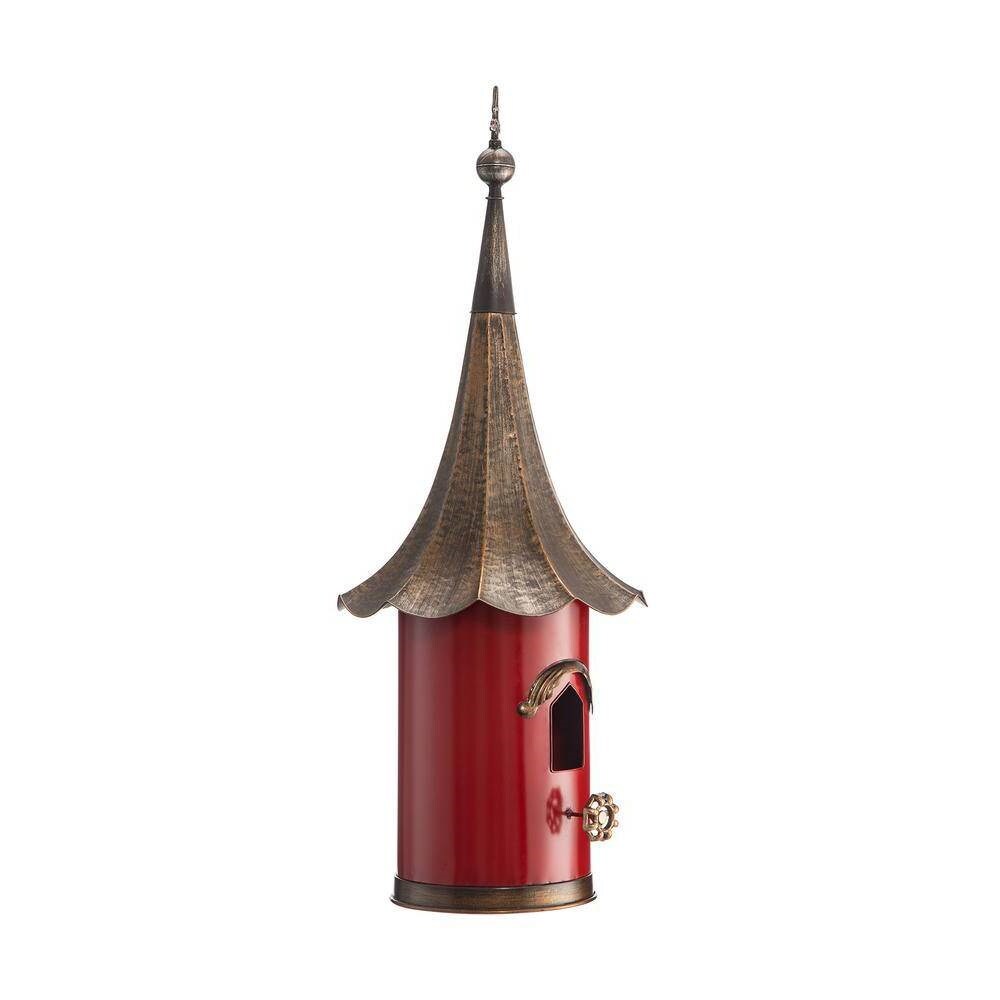 Red Metal Birdhouse with Copper Bronze Gramophone Roof, Oversized Pagoda Design