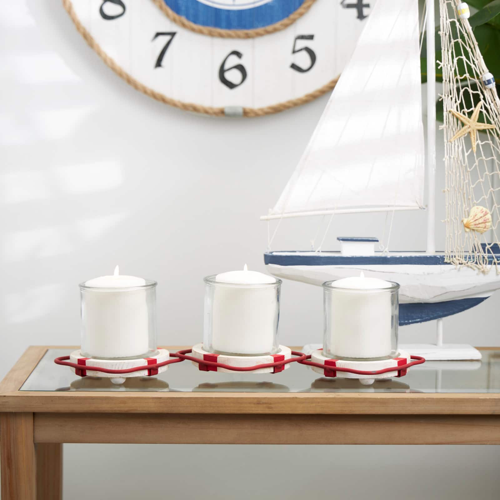 Red Metal Distressed 3-Linked Buoy Candle Holder with White Wood Accents