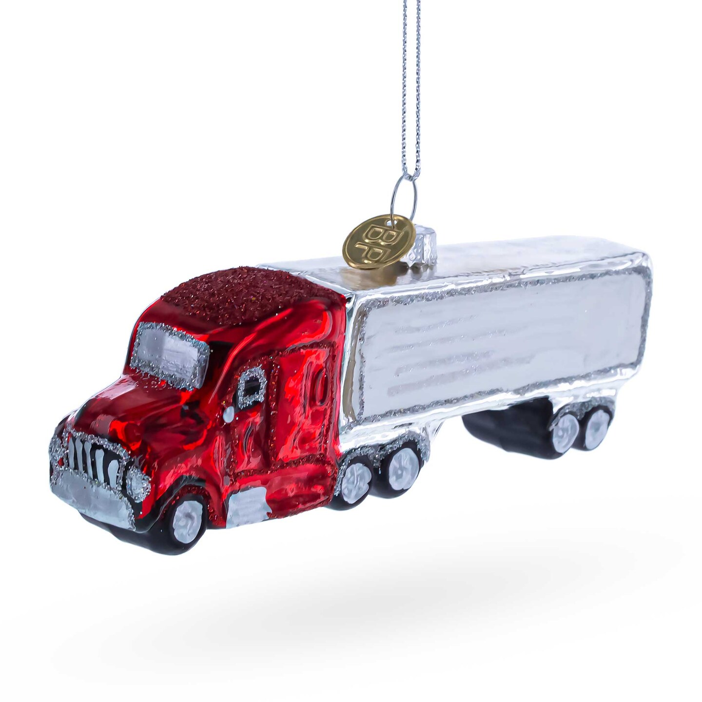 Red Semi Truck with Silver Trailer Glass Christmas Ornament