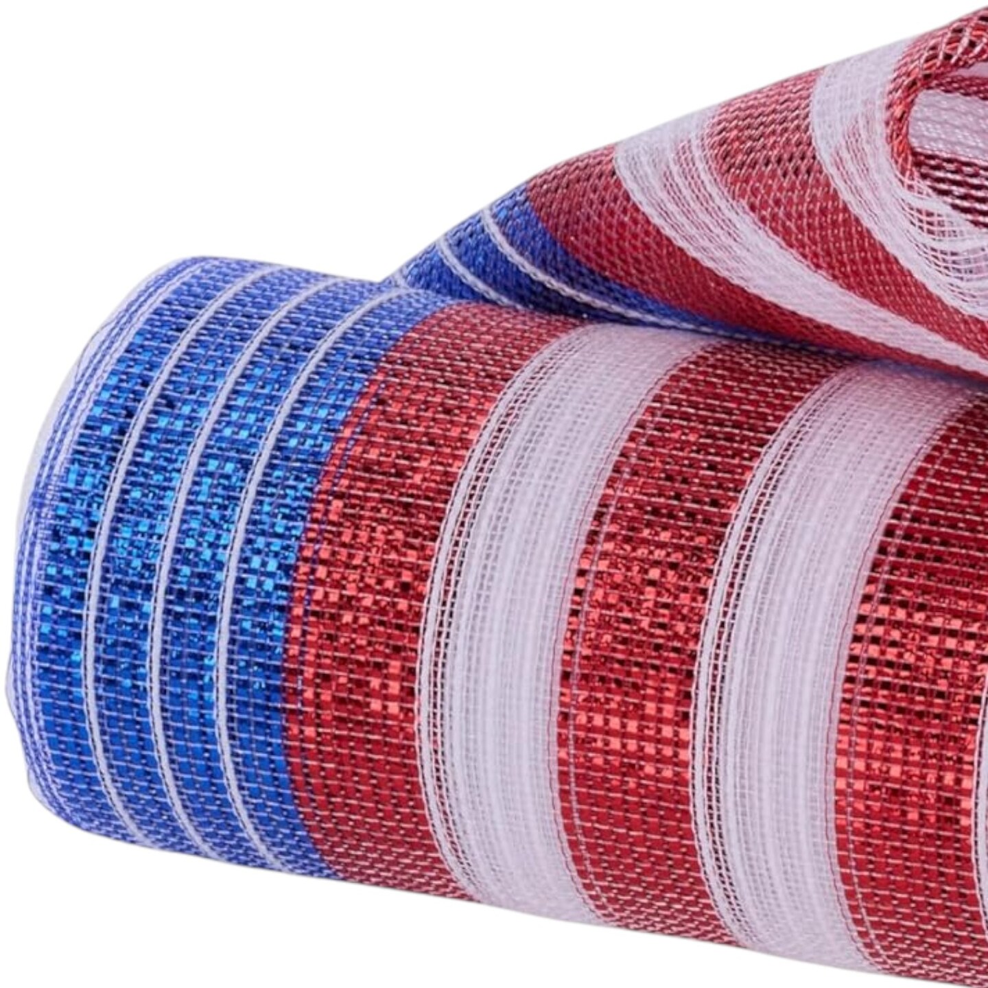 Red, White and Blue Fine Weave Metallic Poly Deco Mesh for Patriotic Wreaths, Bows, Crafts, and Decorations - USA Flag Colors