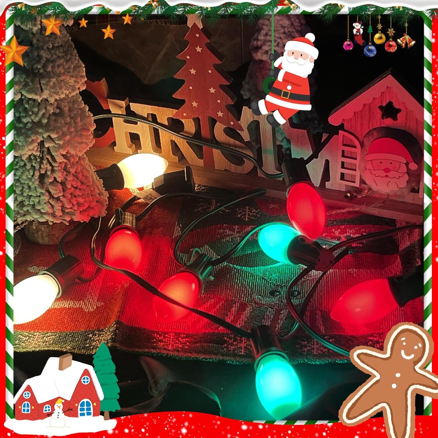 Red White and Green Christmas Lights Outdoor, 25Ft Vintage Christmas String Lights with 26 Multicolor Ceramic Bulbs, Hanging Christmas Decorations Lights Waterproof