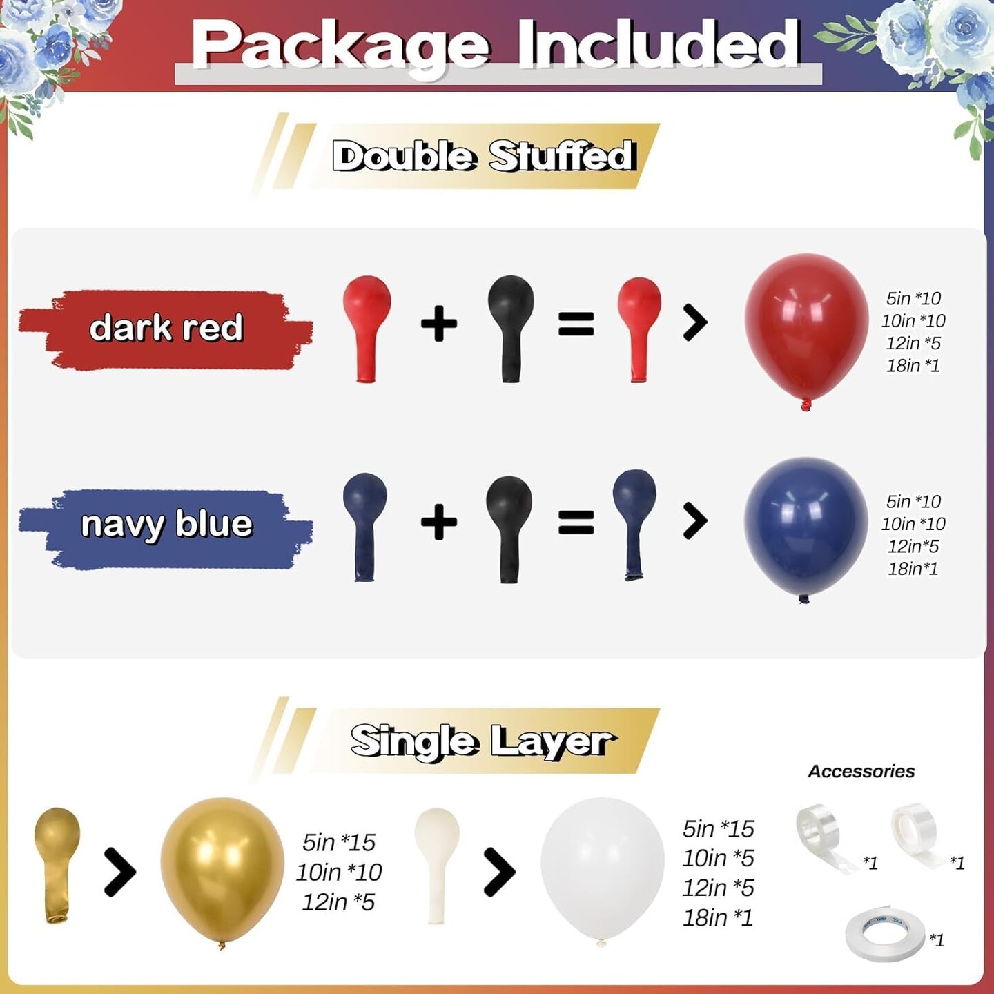 Red White Blue Double-Stuffed Balloon Arch Kit – Navy, Dark Red, Matte White & Metallic Gold