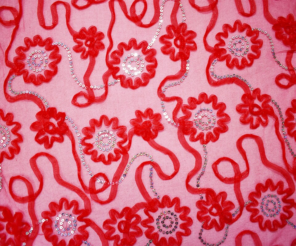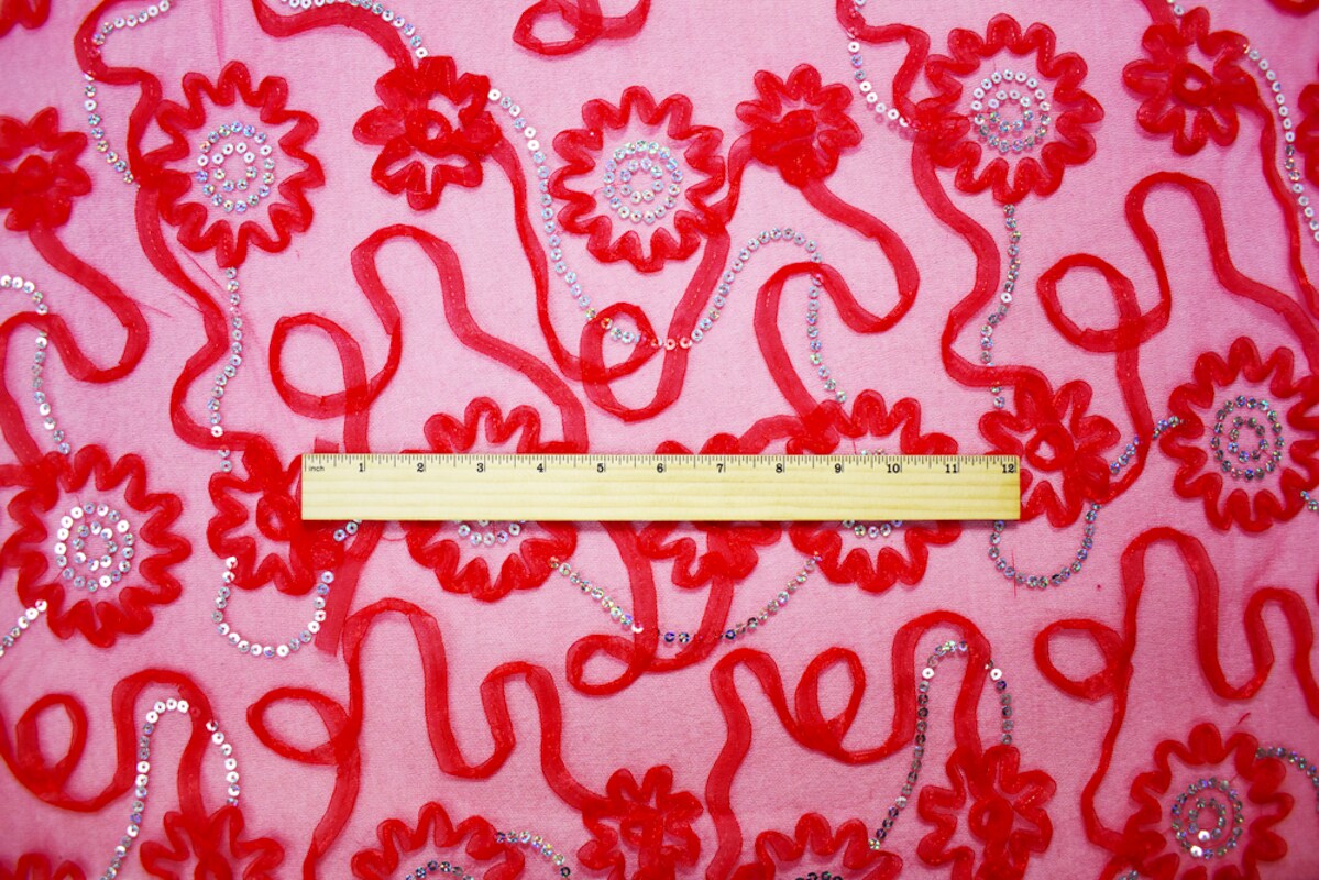 Red-Silver Nylon Floral Applique Sequined Mesh Tulle Fabric By the Yard
