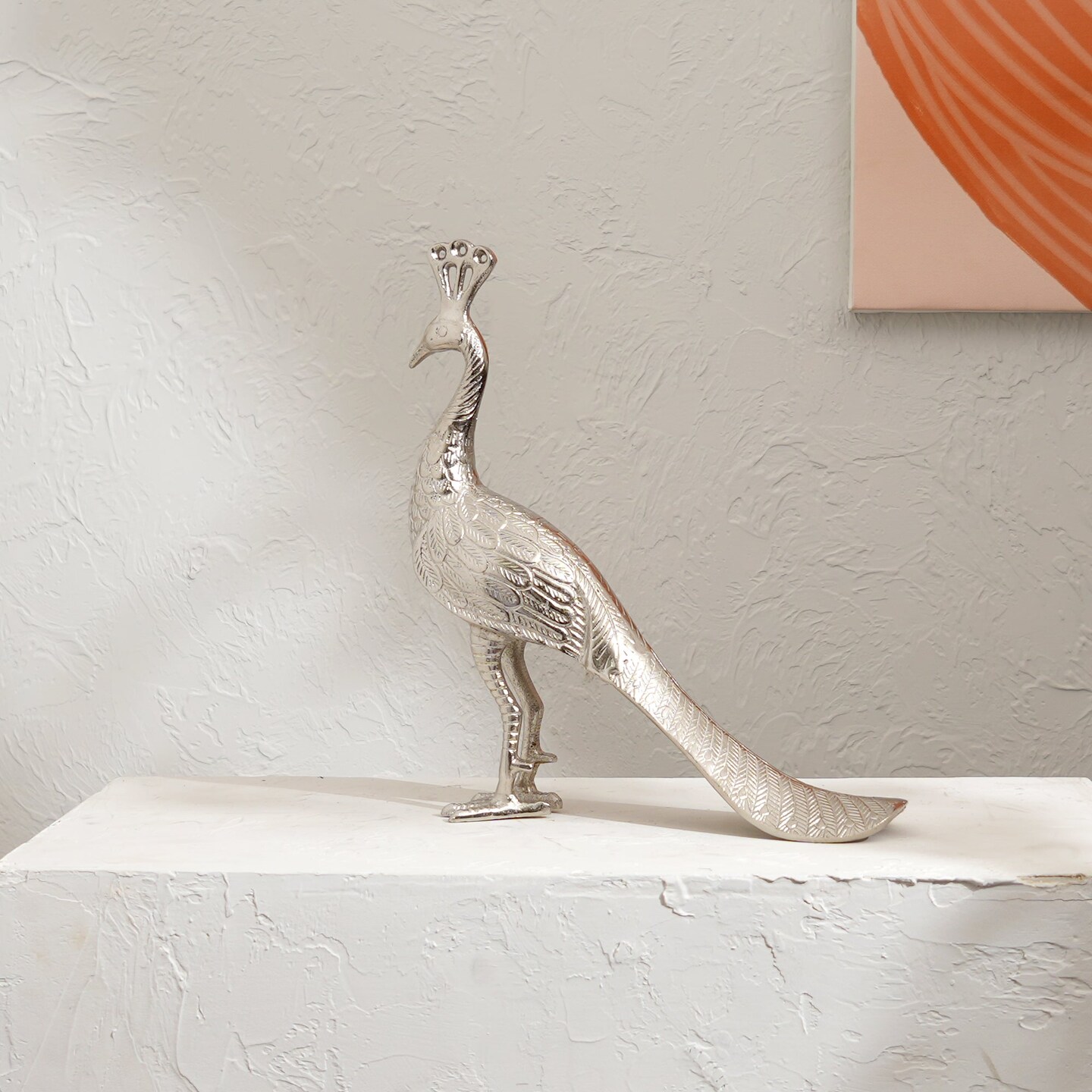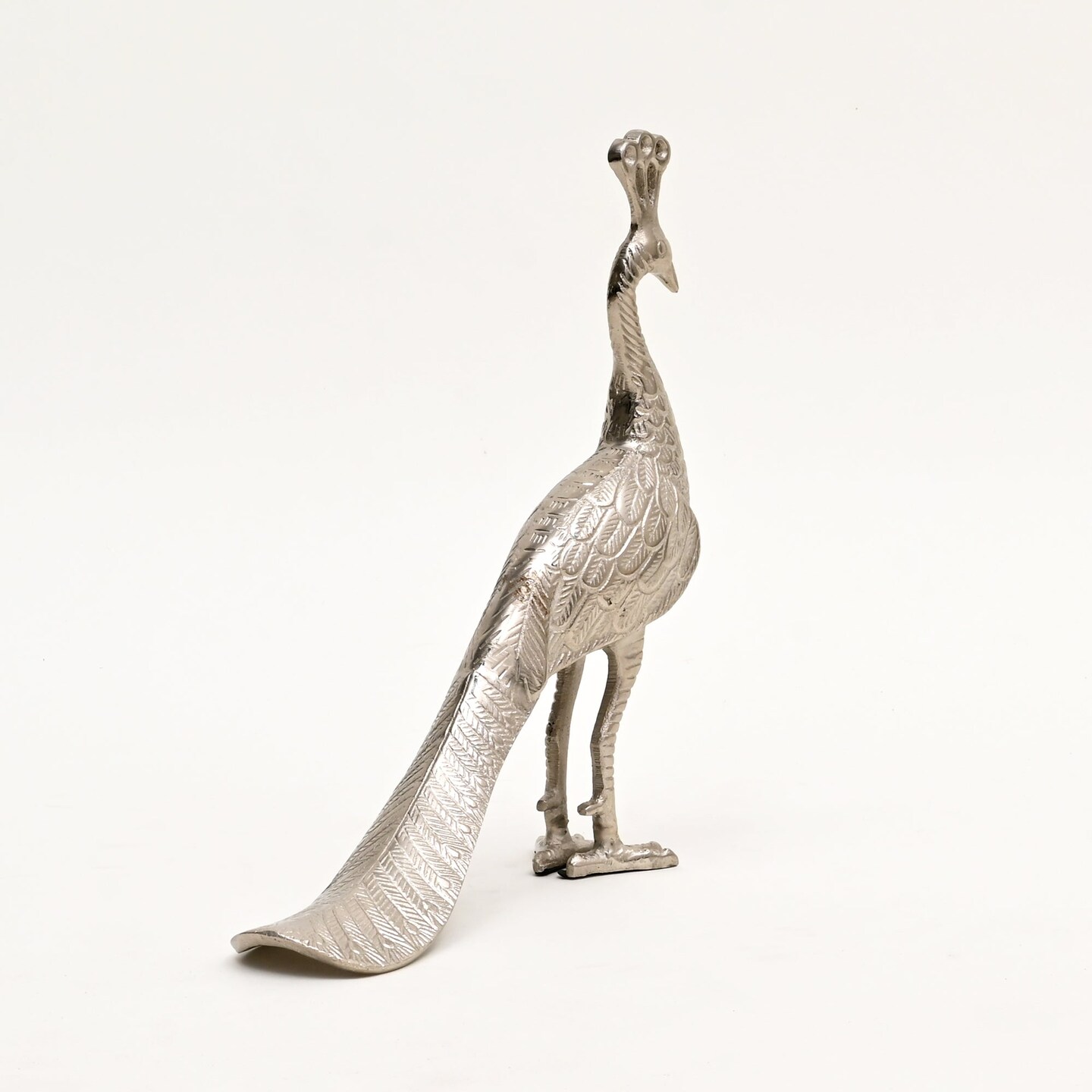 Regal Peacock Nickel Finished Aluminum Figurine – 11x3x3" Elegant Table Decor Sculpture