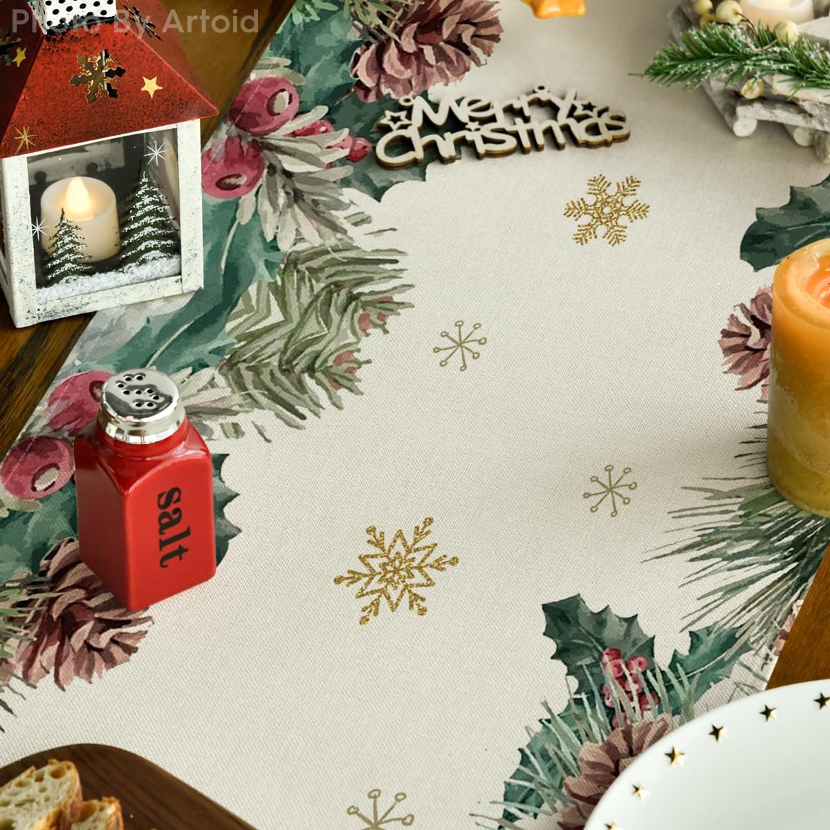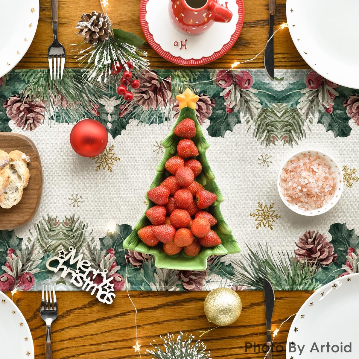 Reindeer Pine Cone Leaves Christmas Table Runner, Seasonal Winter Floral Kitchen Dining Table Decor for Home Party 13x72 Inch