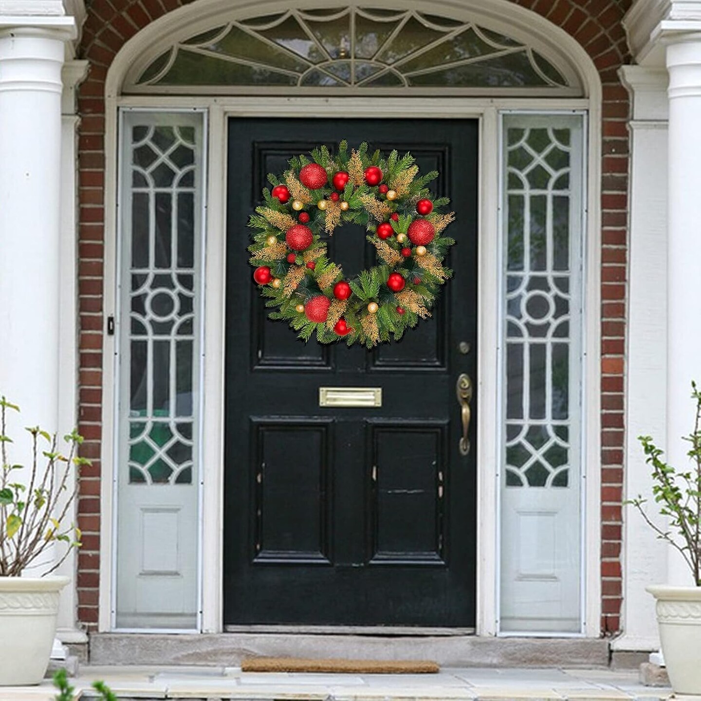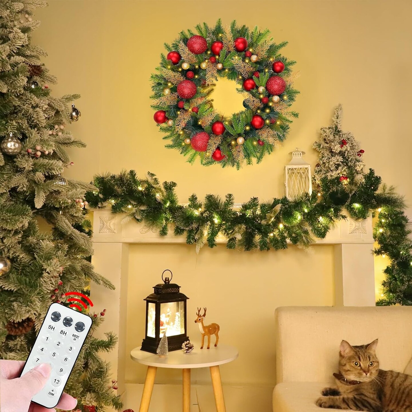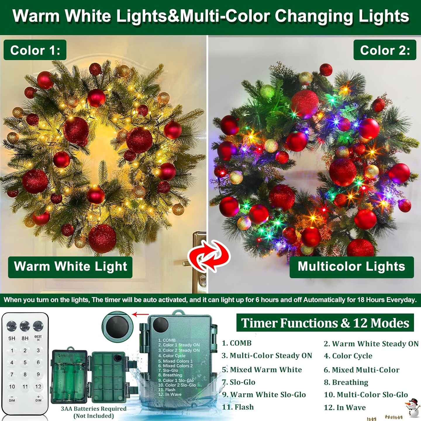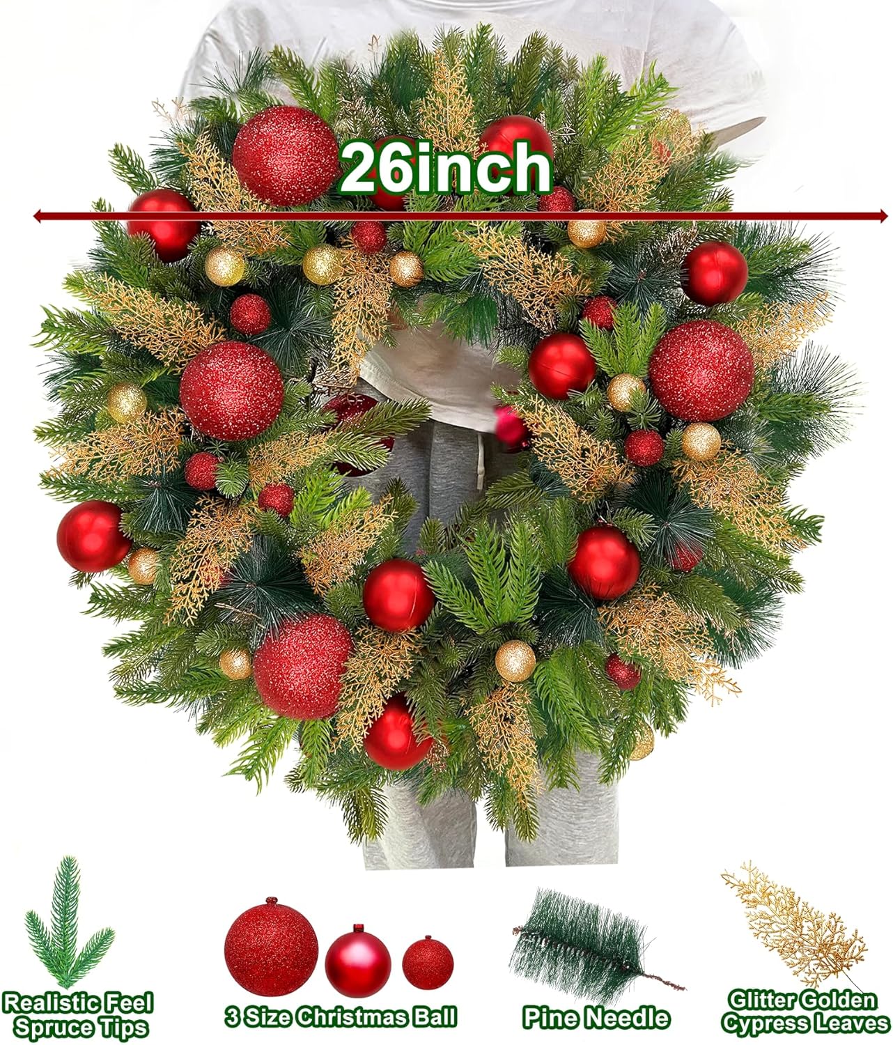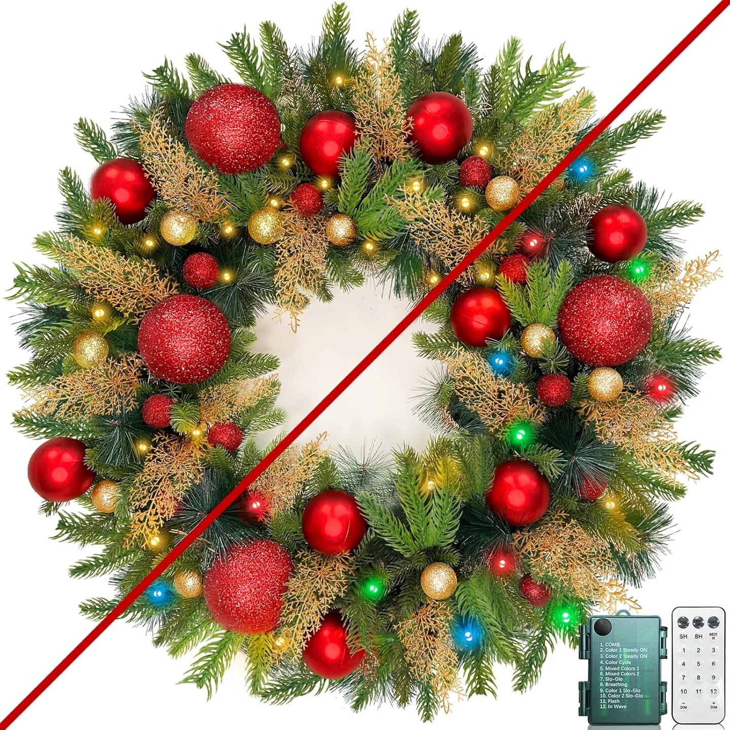 Remote Control-26 Inch Large Thick Prelit Christmas Wreath, Realistic Norfolk PE Pine 50 Warm White&Color Switch Lights Timer 12 Mode, 33 Ball Pine Needles Cypress Leaves Xmas Cedar Door Wreath Decor