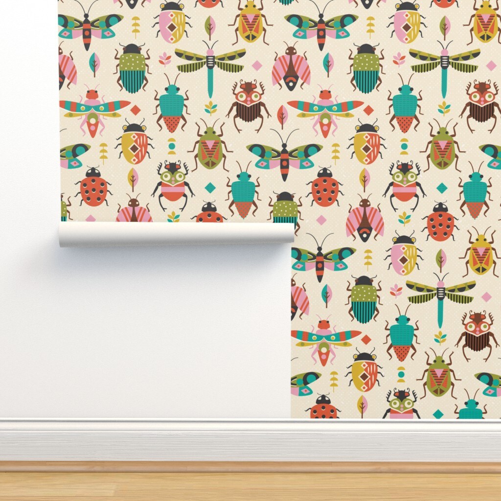 Retro Bugs Butterfly Beetles Nature Colorful Insects Dragon Fly Custom Removable Wallpaper by Spoonflower Peel & Stick Wallpaper 2FT Wide