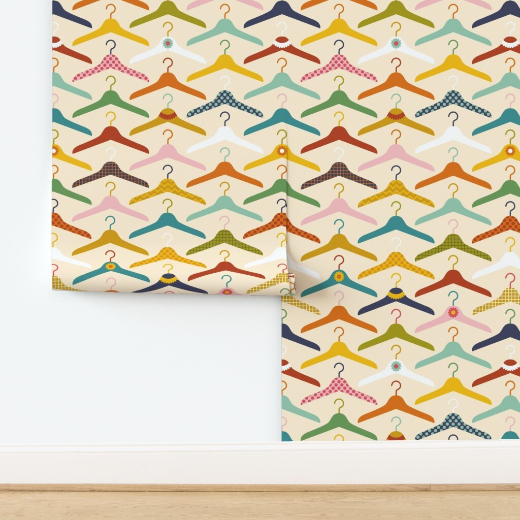 Retro Fashion Novelty Whimsical Polka Dots Clothes Hangers Pink Yellow Orange Flower Check Colorful Doily Lace Laundry Room Closet Clothing Custom Pre-pasted Wallpaper by Spoonflower Pre-Pasted Wallpaper 2FT Wide