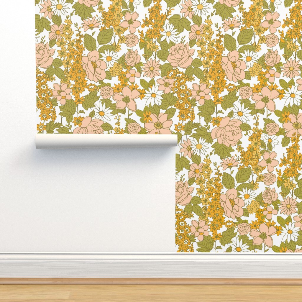Retro Flowers Green Orange Pink 1970s Spring Flower Power Vintage Style Custom Pre-pasted Wallpaper by Spoonflower Pre-Pasted Wallpaper 2FT Wide