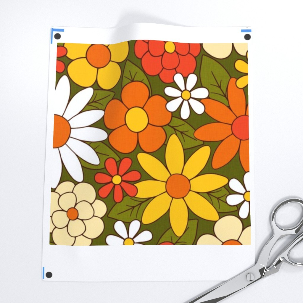 Retro Groovy Botanical Vintage Style Orange Yellow Flowers Green Custom Printed Fabric by Spoonflower Various Fabrics by the Yard or Fat Quarter