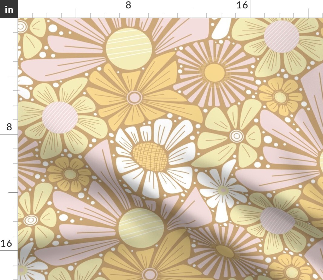 Retro Hippy Floral Yellow Flowers Flower Power Bohemian Sunshine Large Scale Custom Printed Fabric by Spoonflower Various Fabrics by the Yard or Fat Quarter