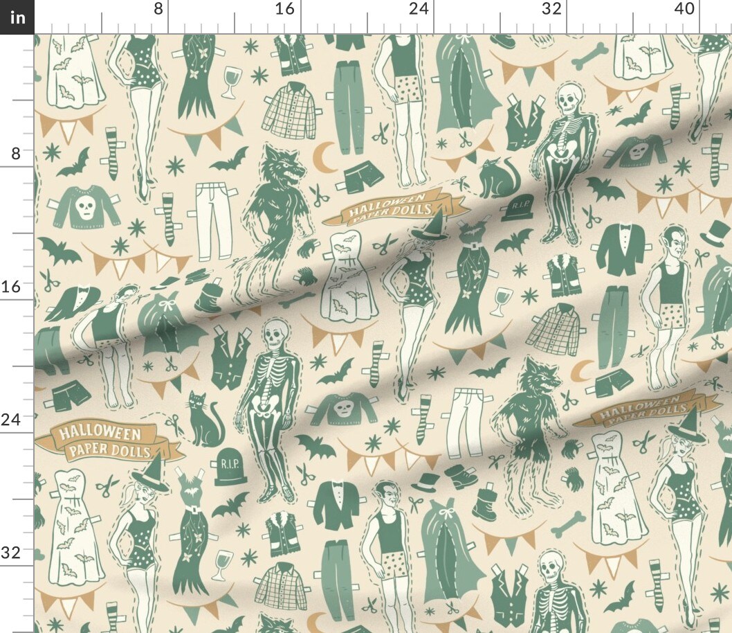 Retro Vintage Halloween Costume Party Witches Skeletons Bats Trick Or Treat Black Cat Vampire Costumes Dress Up Mid Century Mcm Dolls Paper Custom Printed Fabric by Spoonflower Various Fabrics by the Yard or Fat Quarter
