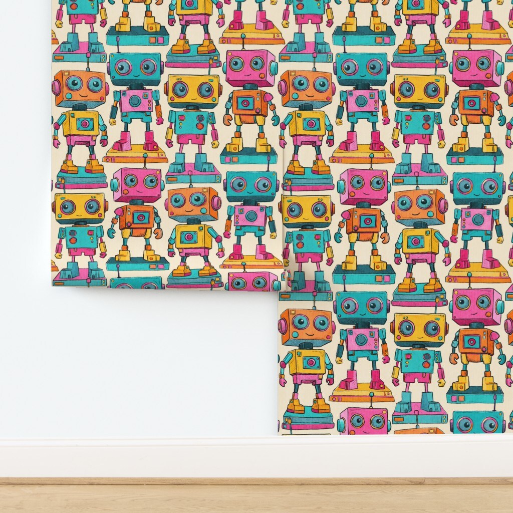 Retro Vintage Toy Robot Kids Room Playroom Playful Colorful Novelty Hand Drawn Blue Pink Yellow Large Scale Toys Happy Cheerful Games Sci Fi Custom Pre-pasted Wallpaper by Spoonflower Pre-Pasted Wallpaper 2FT Wide