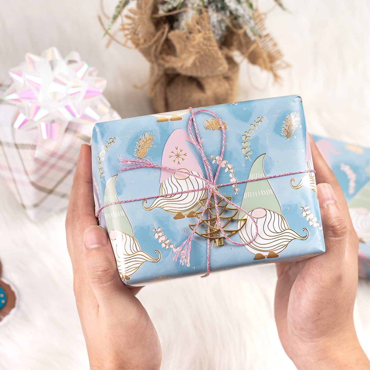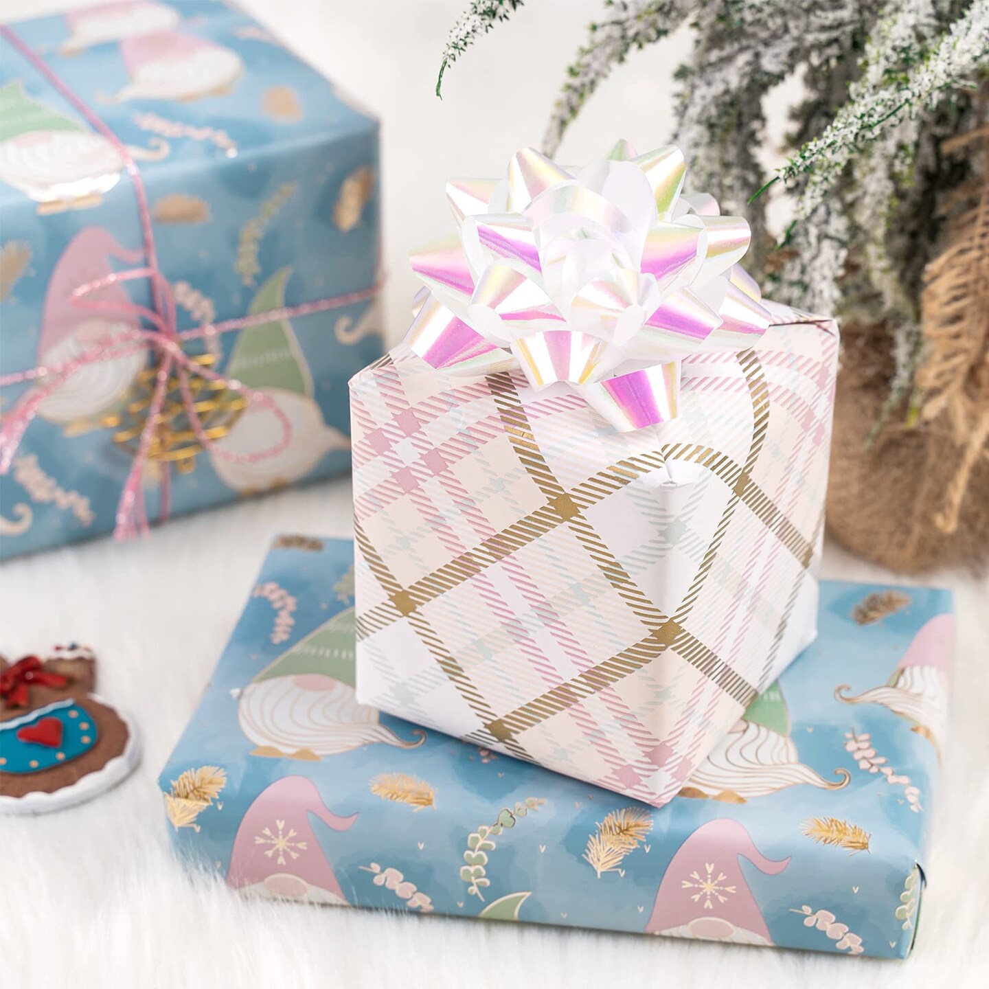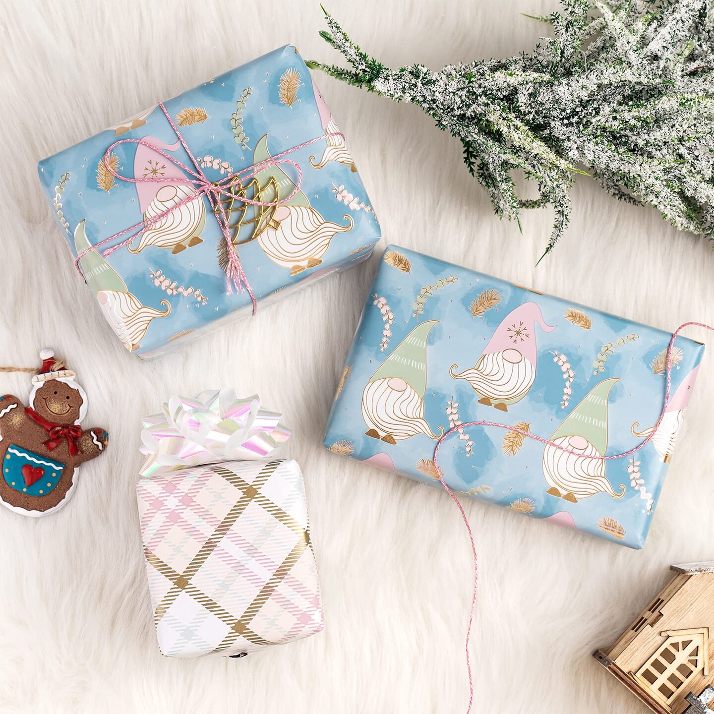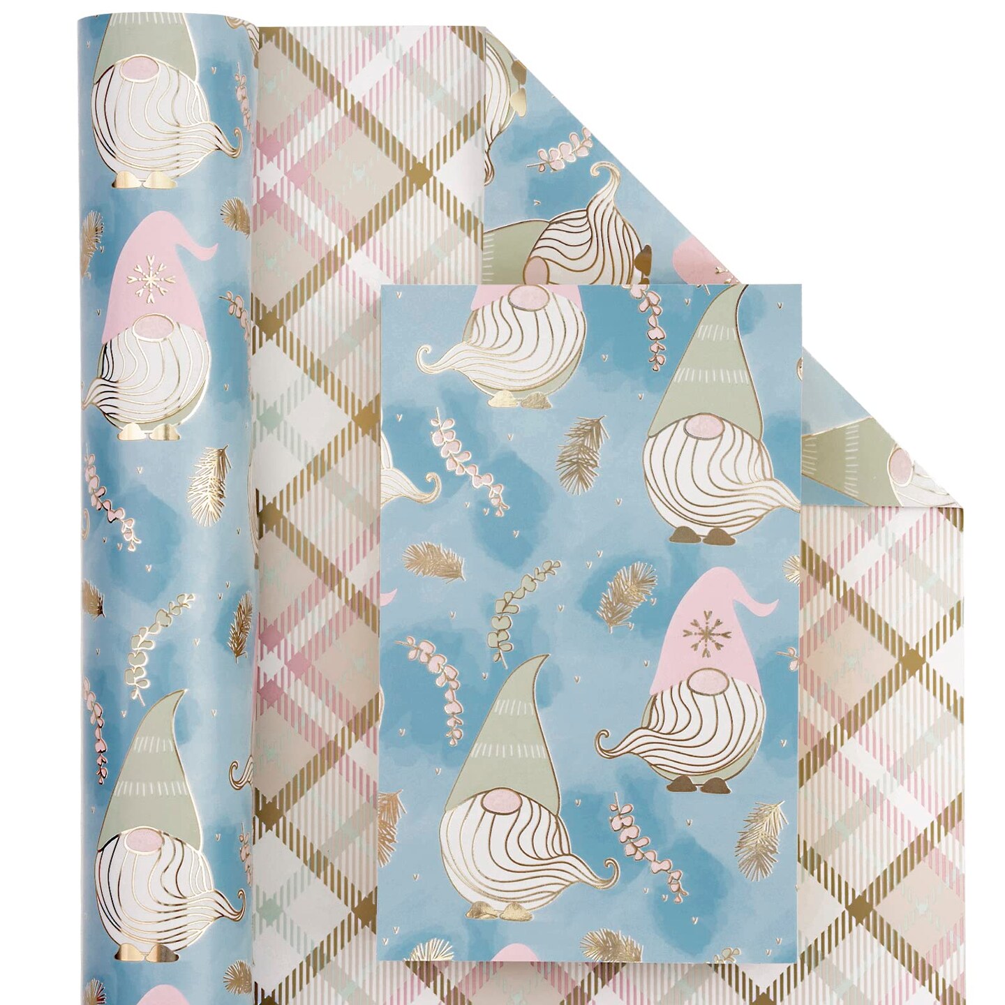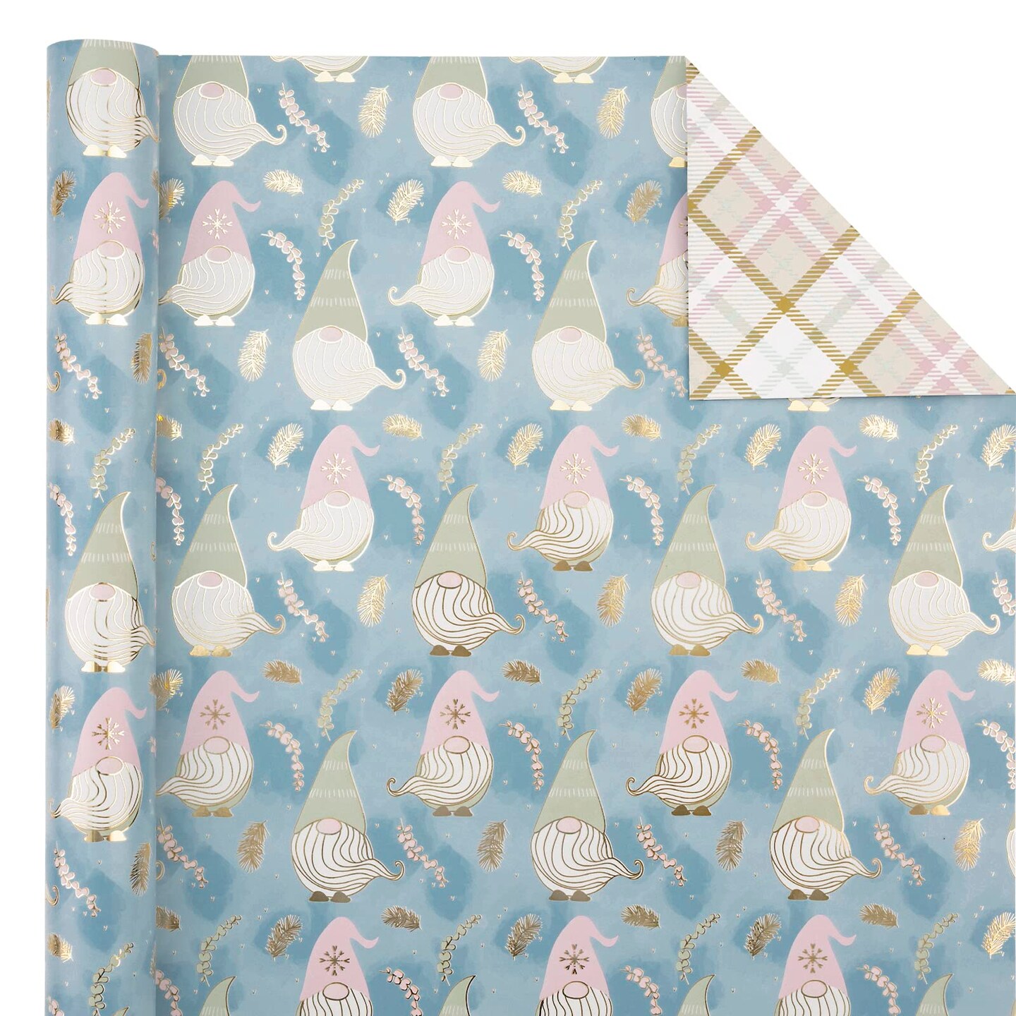 Reversible Christmas Wrapping Paper - Mini Roll - 17 Inch x 33 Feet - Blue Purple Gnome and Plaid Design with Metallic Foil Shine for Holiday, Party, Celebration