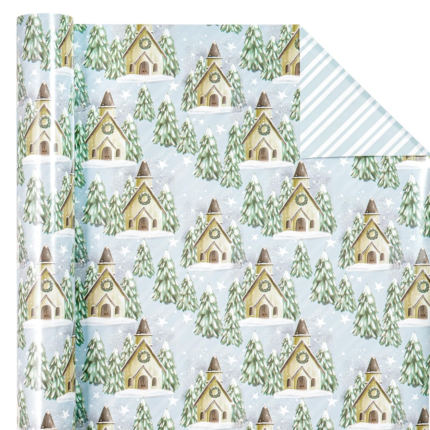 Reversible Christmas Wrapping Paper - Mini Roll - 17 Inch X 33 Feet - Silver and White Christmas Tree and House Printed on Pearlized Paper for Holidays
