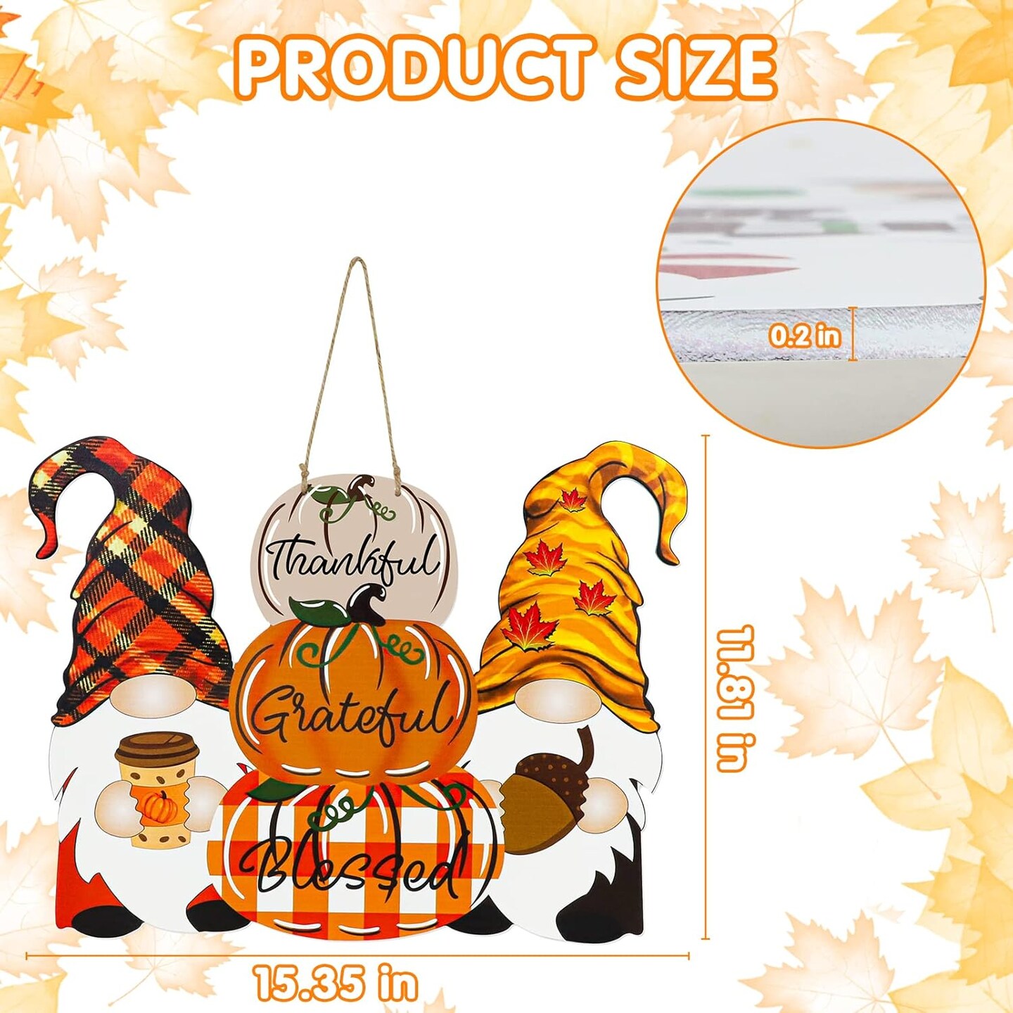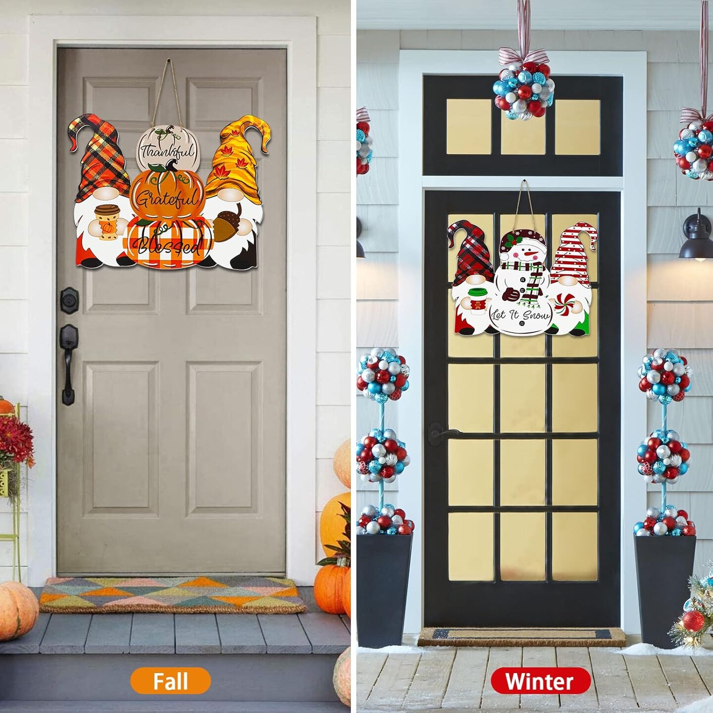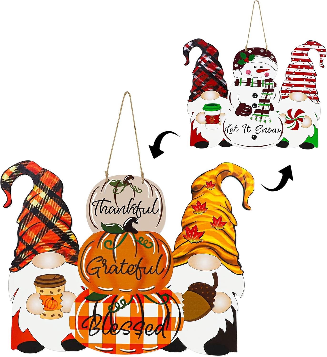 Reversible Fall & Christmas Door Decor – Wooden Pumpkin & Snowman Hanging Sign, Thanksgiving & Holiday Porch Wall Decoration, Buffalo Plaid “Thankful” / “Let It Snow” (Orange/Red) 11.81"L x 15.35"W